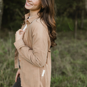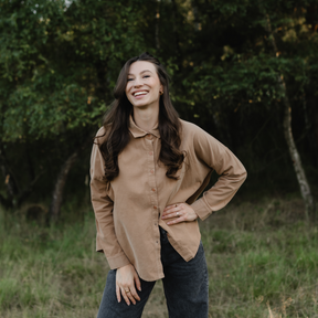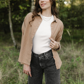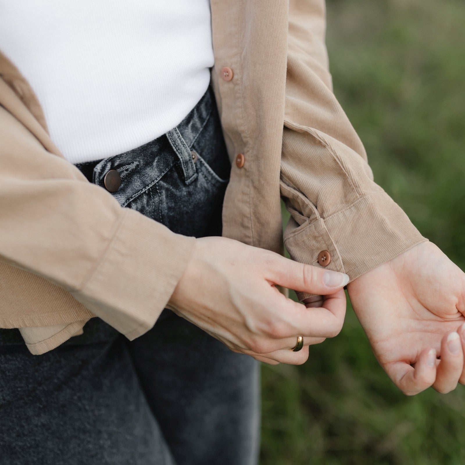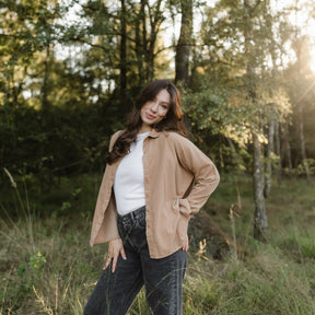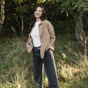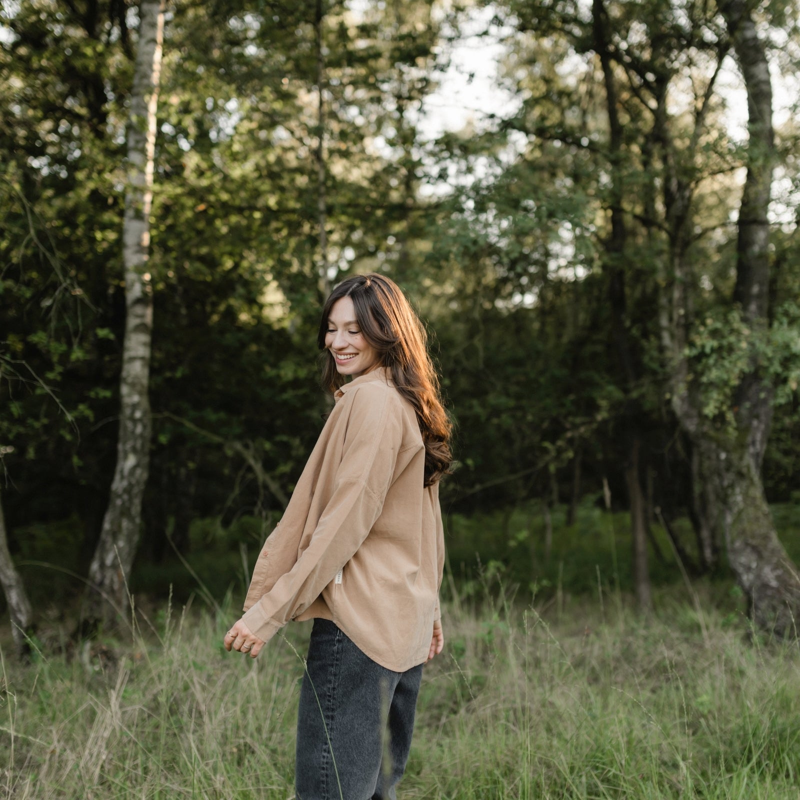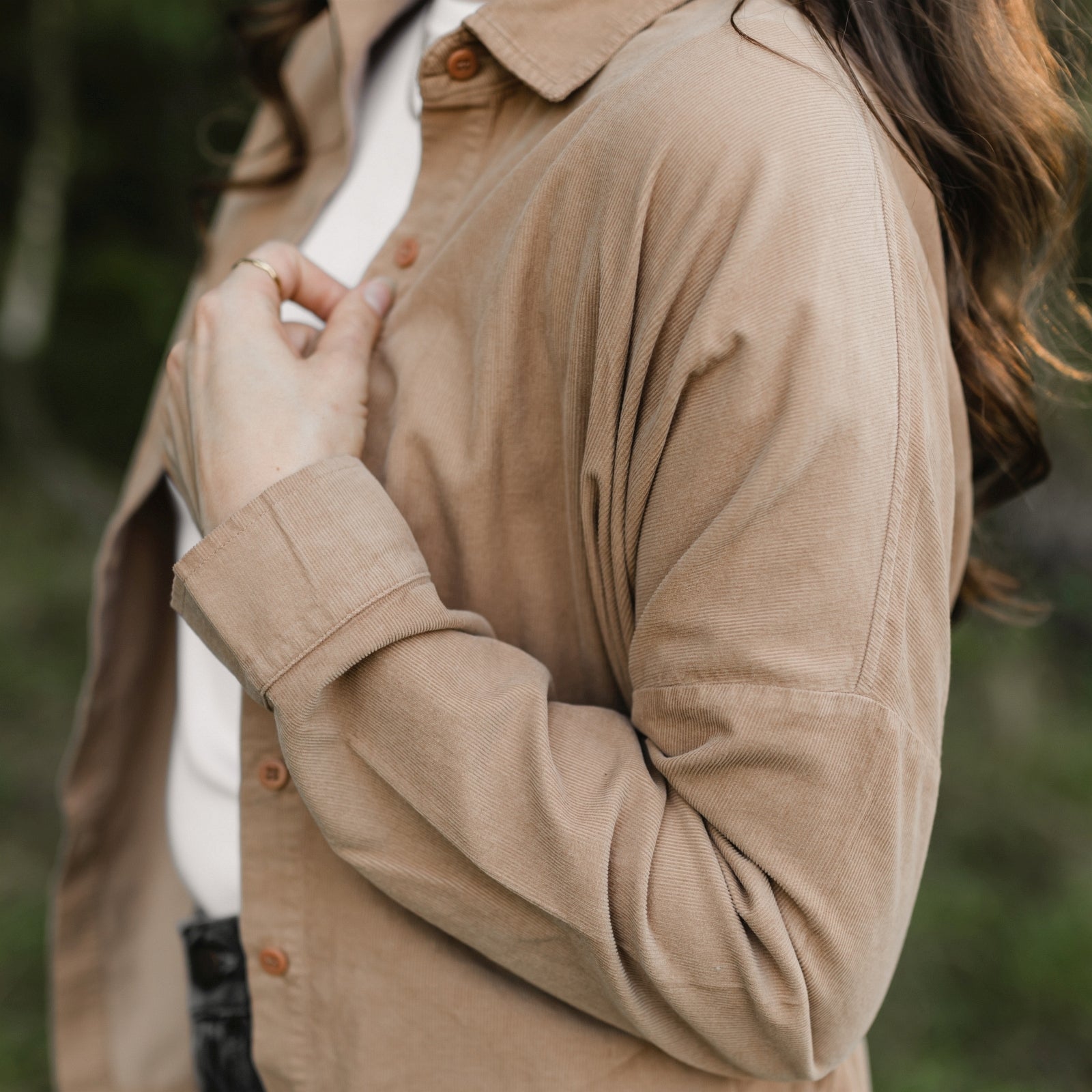 Die Nordlicht Cord Bluse Ruby verbindet moderne Lässigkeit mit hochwertiger Verarbeitung. Gefertigt aus weichem Babycord aus 100% Bio-Baumwolle, ist sie angenehm zu tragen und ideal für die kühleren Monate. Die lockere Passform, überschnittenen Schultern und tonalen Corozo-Knöpfe verleihen der Bluse eine entspannte Silhouette mit moderner Schlichtheit – vielseitig kombinierbar und zeitlos tragbar.