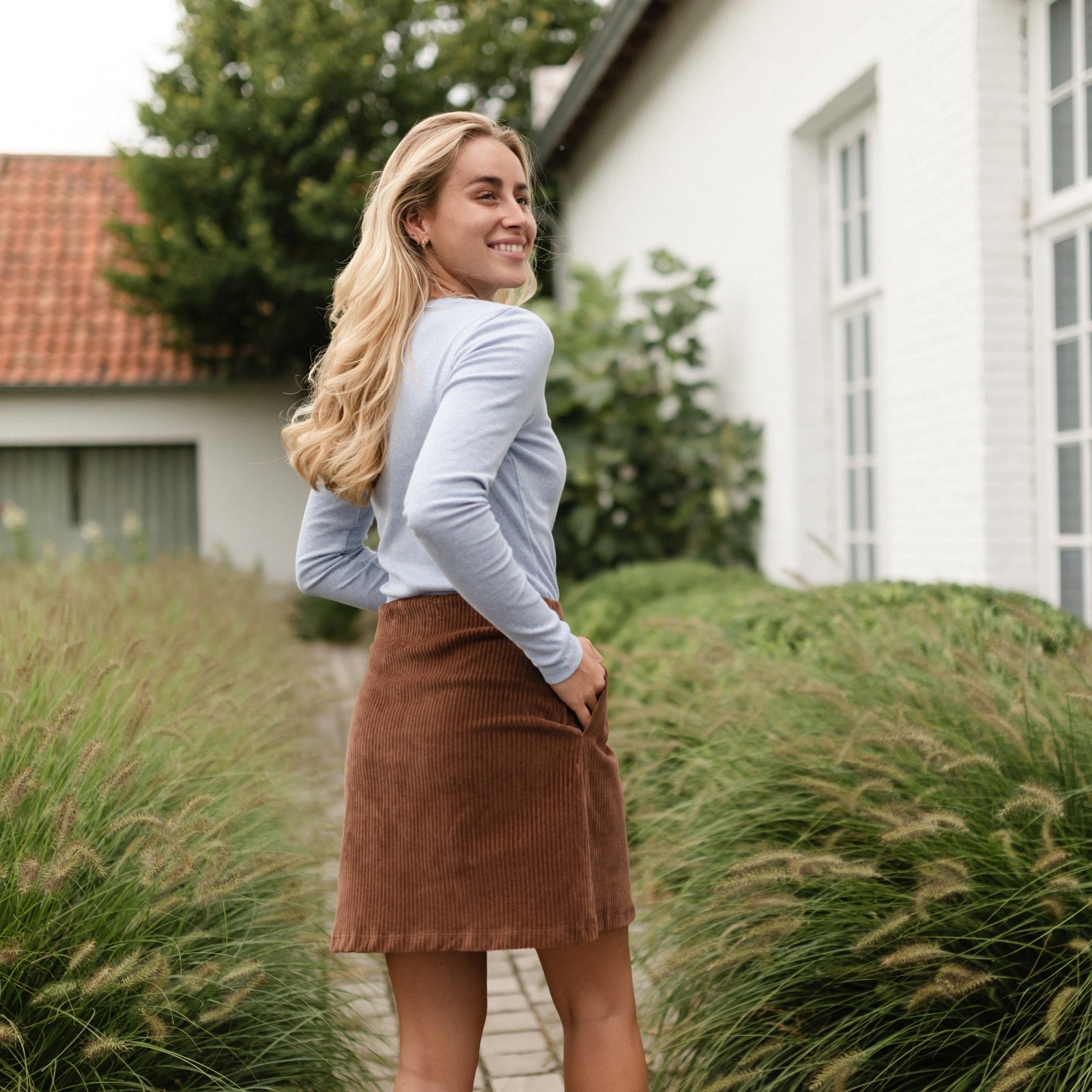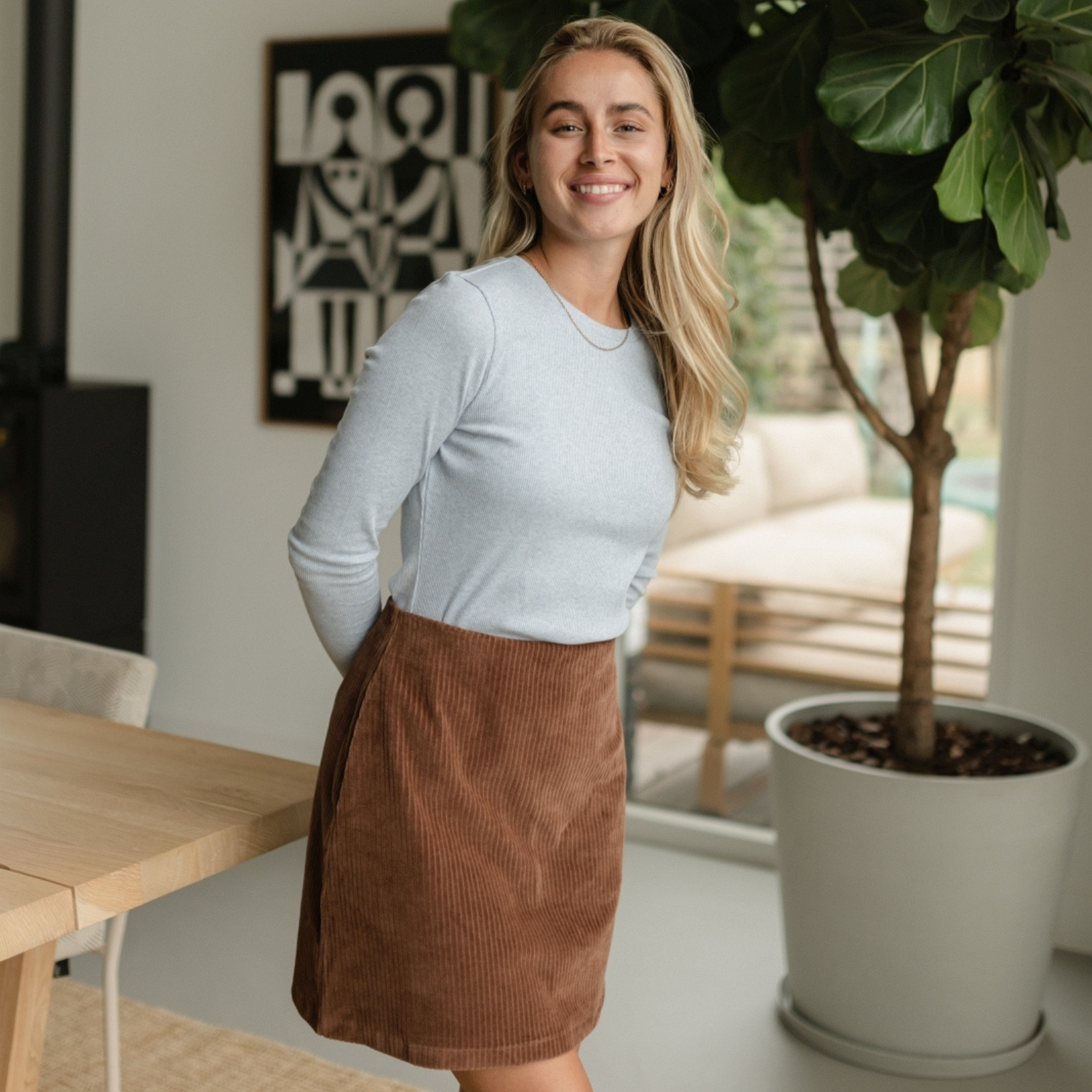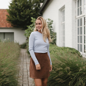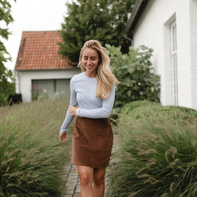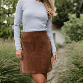 All-Season Favorit | Der Jersey Cordrock ist ideal für die kühlere Jahreszeit, da er sich mit warmen Strumpfhosen, Pullovern oder Strickjacken kombinieren lässt. Im Sommer kann er dann mit einem leichten T-Shirt oder Top getragen werden, sodass du das ganze Jahr über von deinem neuen Lieblingsteil profitierst.