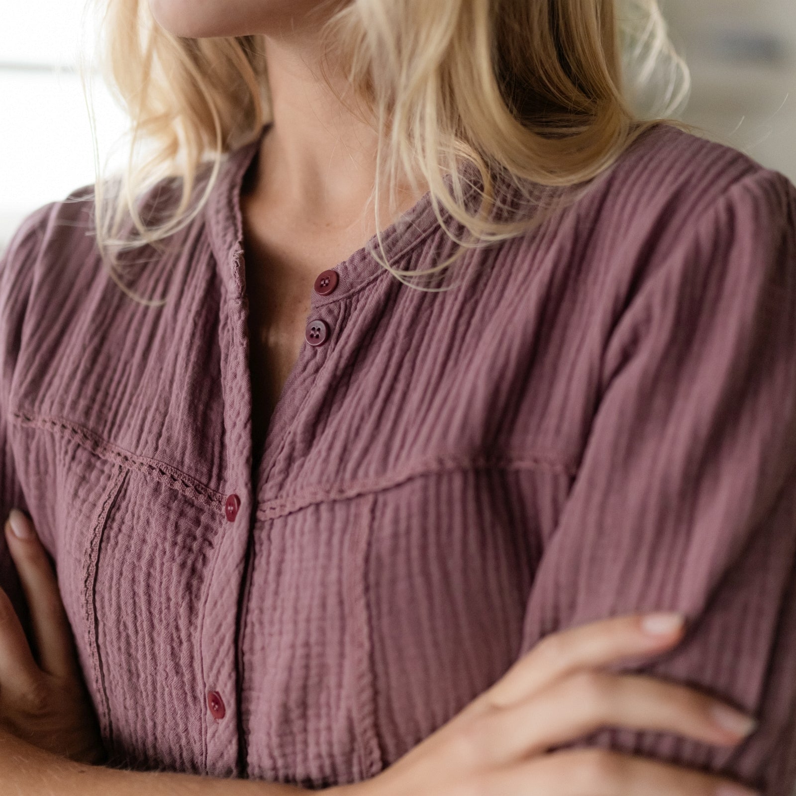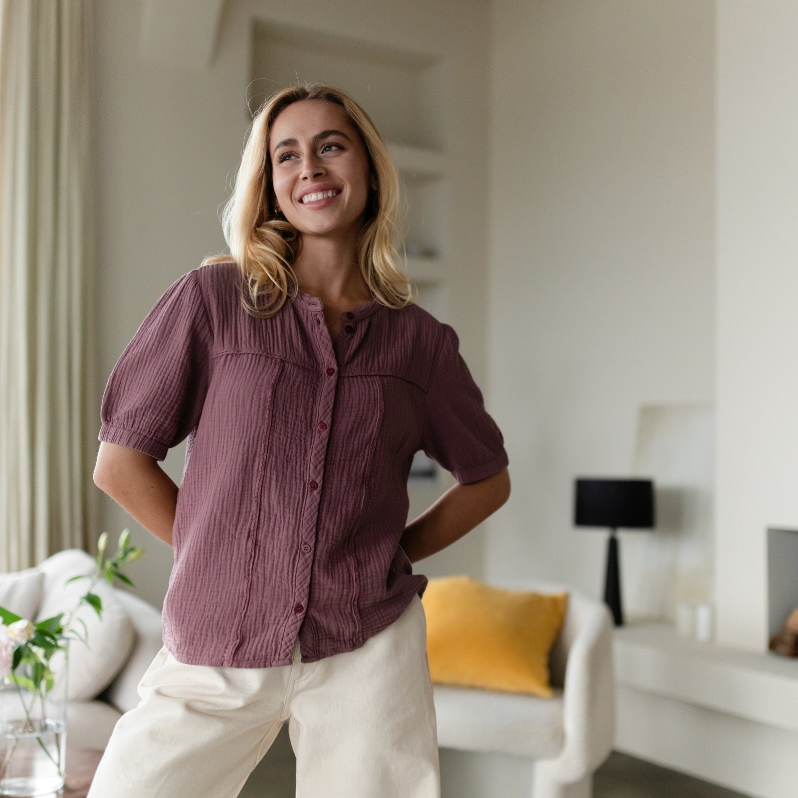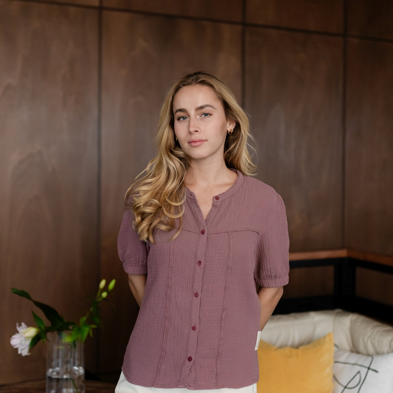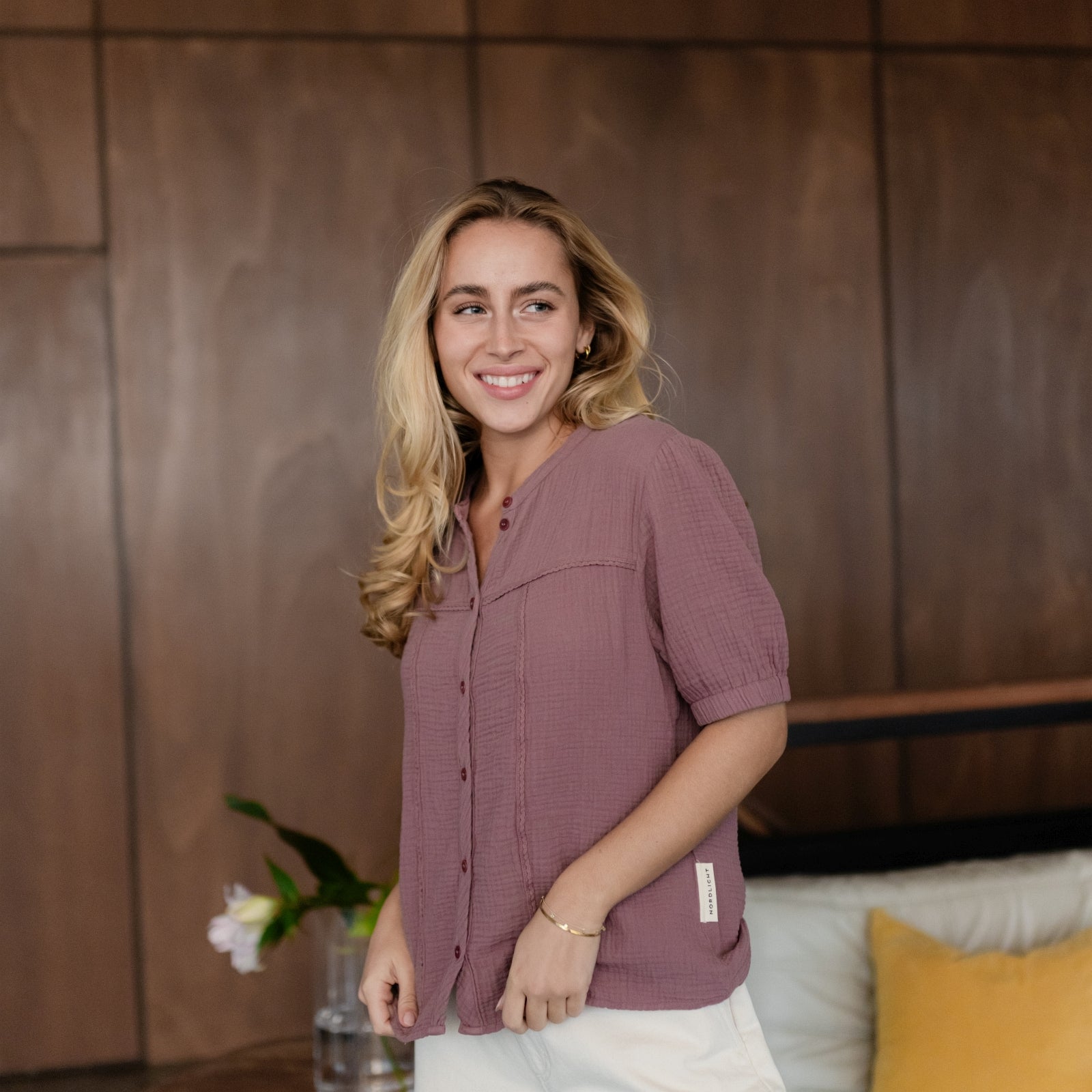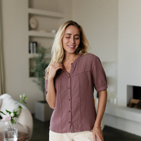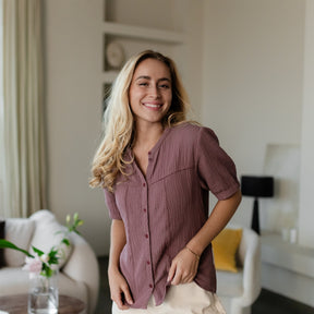 Musselin aus Bio-BaumwolleUnsere Nordlicht Musselin Bluse Emi vereint feminine Leichtigkeit mit zeitgemäßem Design. Hergestellt aus 100 % Bio-Baumwolle, fühlt sich der luftige Musselin-Stoff wunderbar weich an und sorgt für ein angenehmes Tragegefühl. Die kurzen, leicht gepufften Ärmel verleihen der Bluse eine romantische Note, während die schlichte Knopfleiste aus edlen Corozo-Knöpfen den modernen Look unterstreicht.
