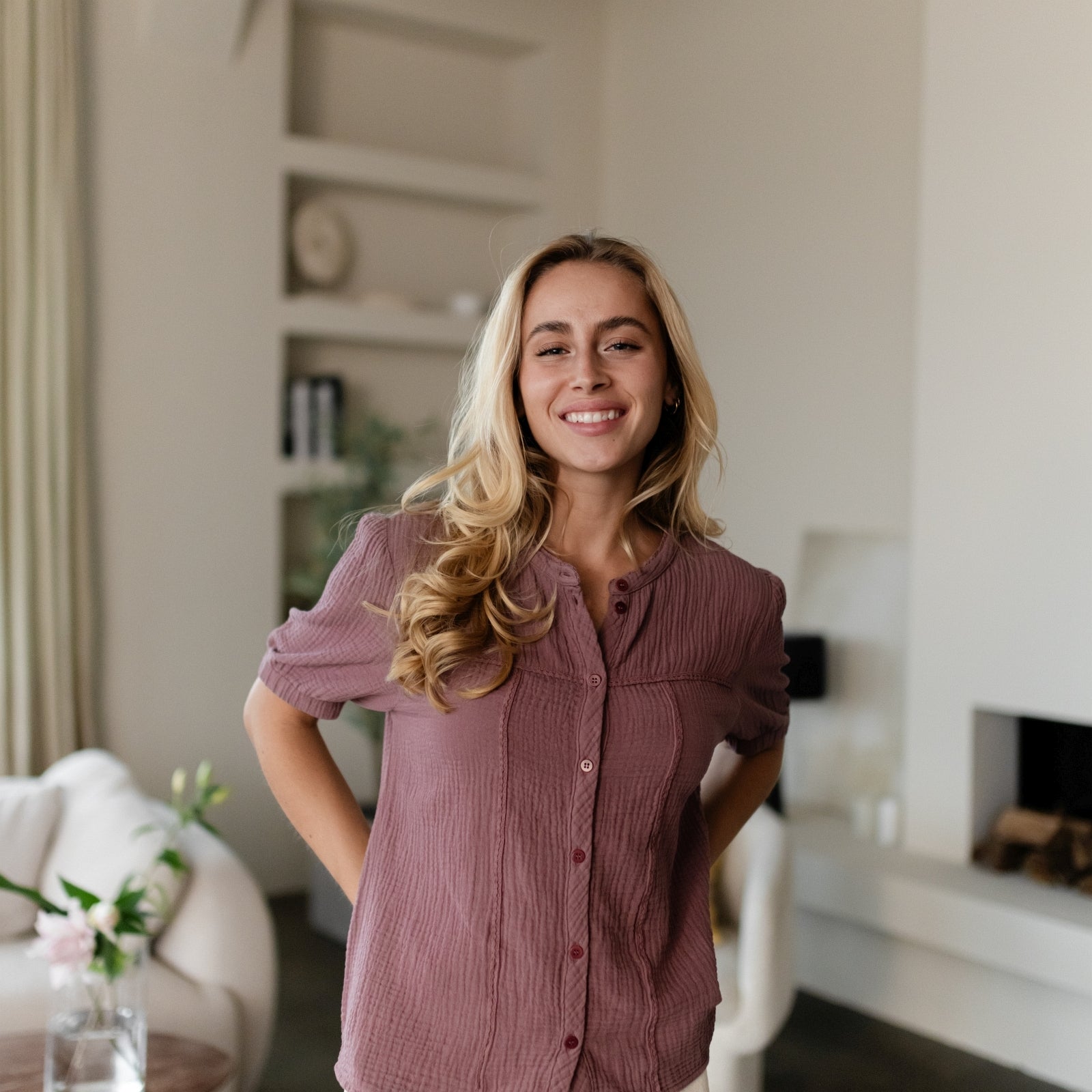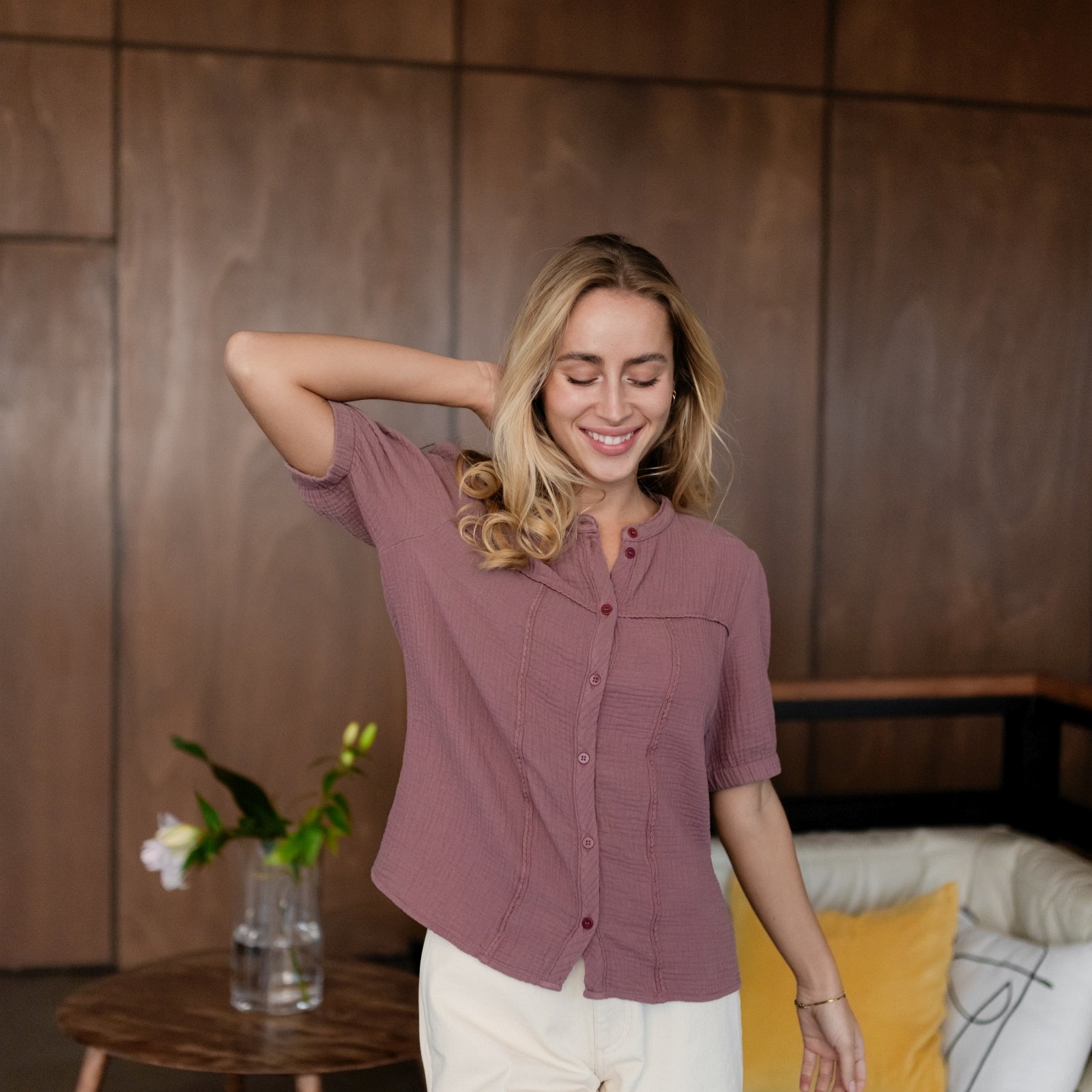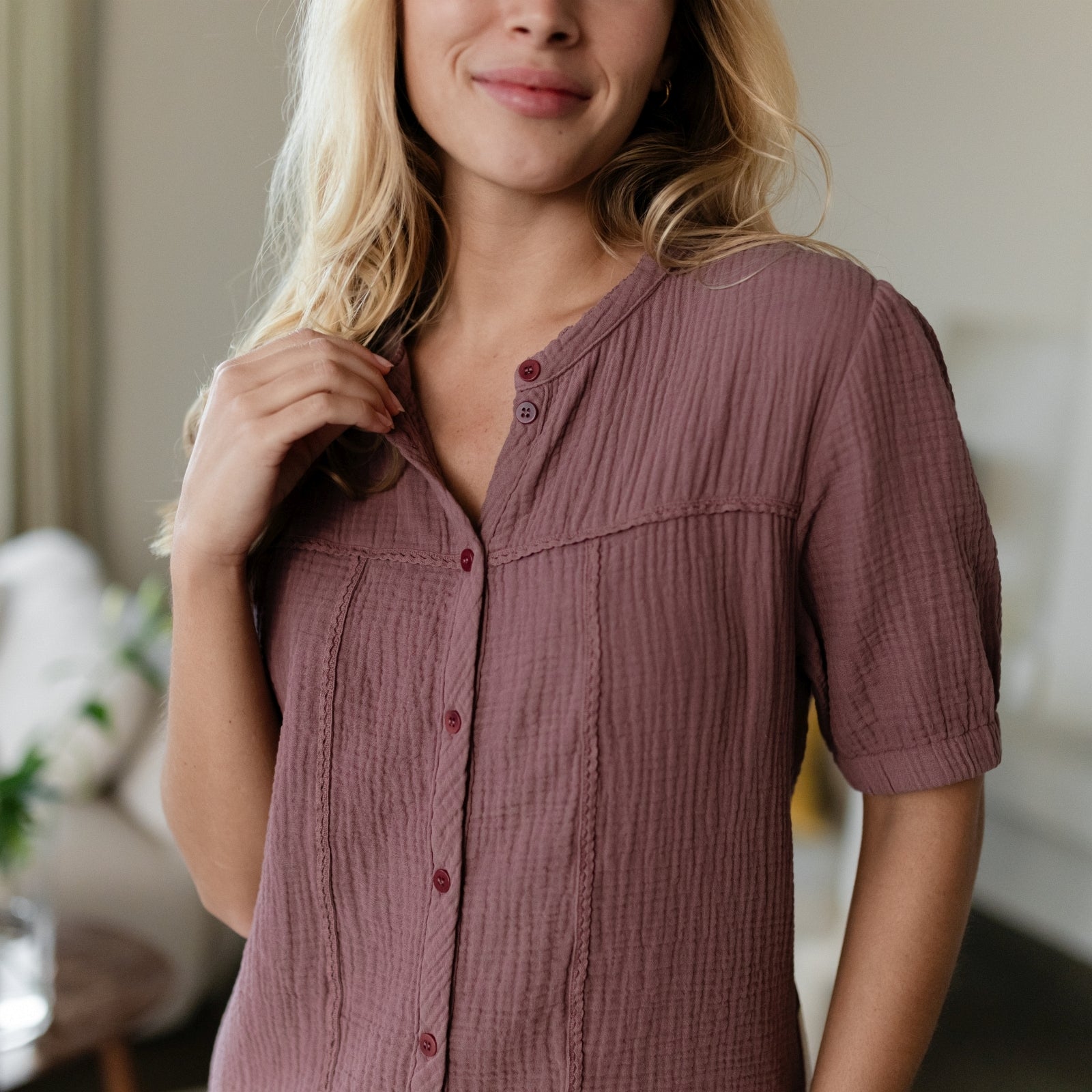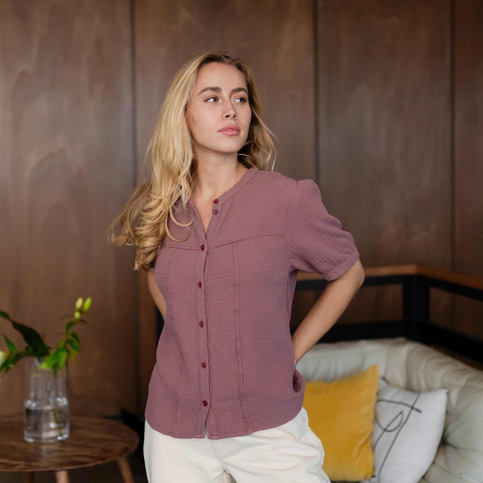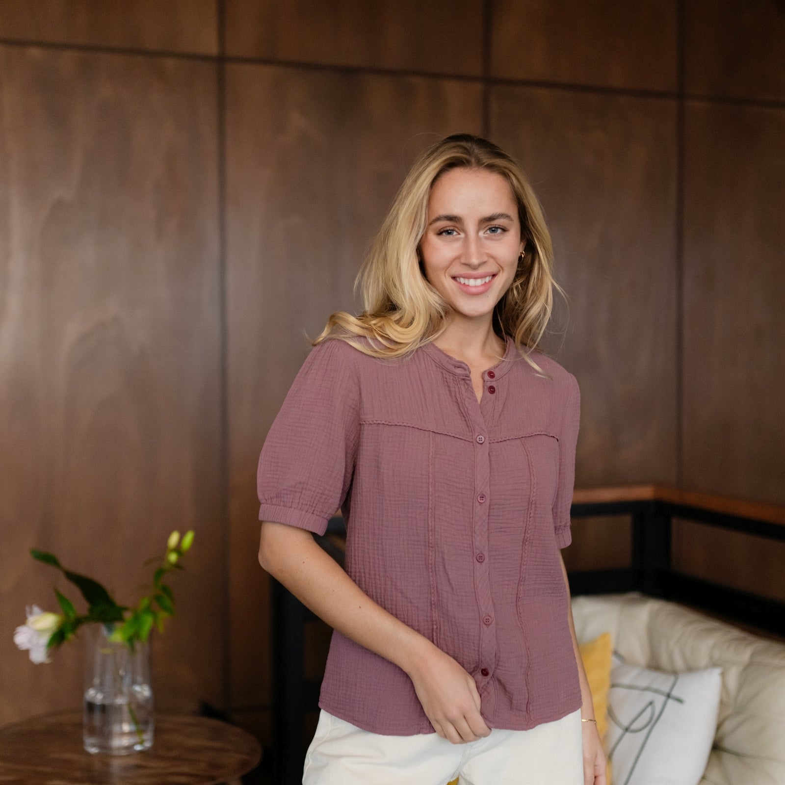 Musselin aus Bio-BaumwolleUnsere Nordlicht Musselin Bluse Emi vereint feminine Leichtigkeit mit zeitgemäßem Design. Hergestellt aus 100 % Bio-Baumwolle, fühlt sich der luftige Musselin-Stoff wunderbar weich an und sorgt für ein angenehmes Tragegefühl. Die kurzen, leicht gepufften Ärmel verleihen der Bluse eine romantische Note, während die schlichte Knopfleiste aus edlen Corozo-Knöpfen den modernen Look unterstreicht.