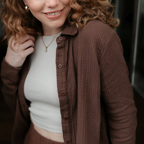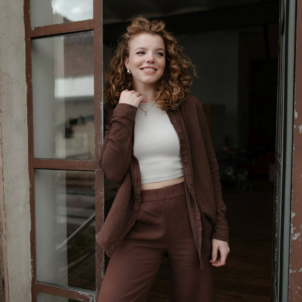 Musselin aus Bio-BaumwolleEuer Bestseller jetzt in Maxi-Länge: ALMA Lang in Braun ist leicht, luftig und stilvoll. Der weiche Musselin-Stoff aus 100 % Bio-Baumwolle fühlt sich angenehm an und fällt fließend – ganz ohne Faltenbildung. Seitliche Schlitze bieten zusätzliche Bewegungsfreiheit, während der feminine V-Ausschnitt mit nachhaltigen Knöpfen ein dezentes Highlight setzt. Perfekt für einen entspannten, eleganten Look.