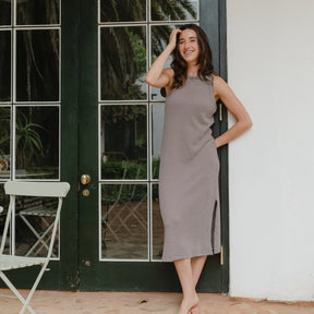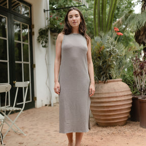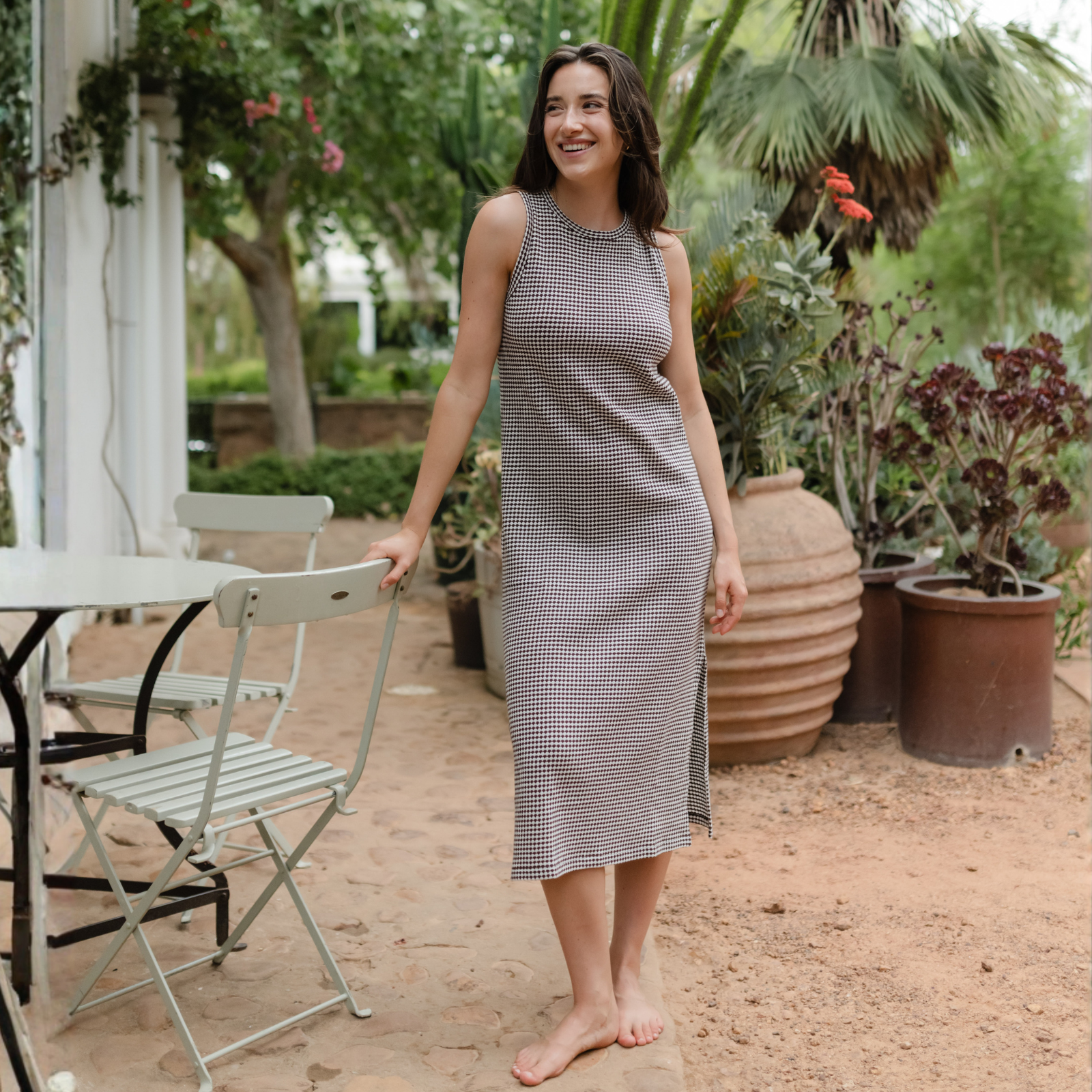 Jerseystoff aus Bio-BaumwolleDas Nordlicht Jersey Kleid Rita vereint zeitloses Streifendesign mit nachhaltigem Komfort. Das dunkelbraun weiße Muster verleiht dem ärmellosen Tank Kleid eine klare, moderne Ausstrahlung und macht es zu einem vielseitigen Begleiter für jeden Tag. Der körpernahe Fit und die Midi Länge sorgen für eine feminine Silhouette, während der weiche Jersey angenehm auf der Haut liegt und sich flexibel deinen Bewegungen anpasst. Ein unkompliziertes Kleid, das du solo tragen oder mit Strickjacke und Sneakern kombinieren kannst.