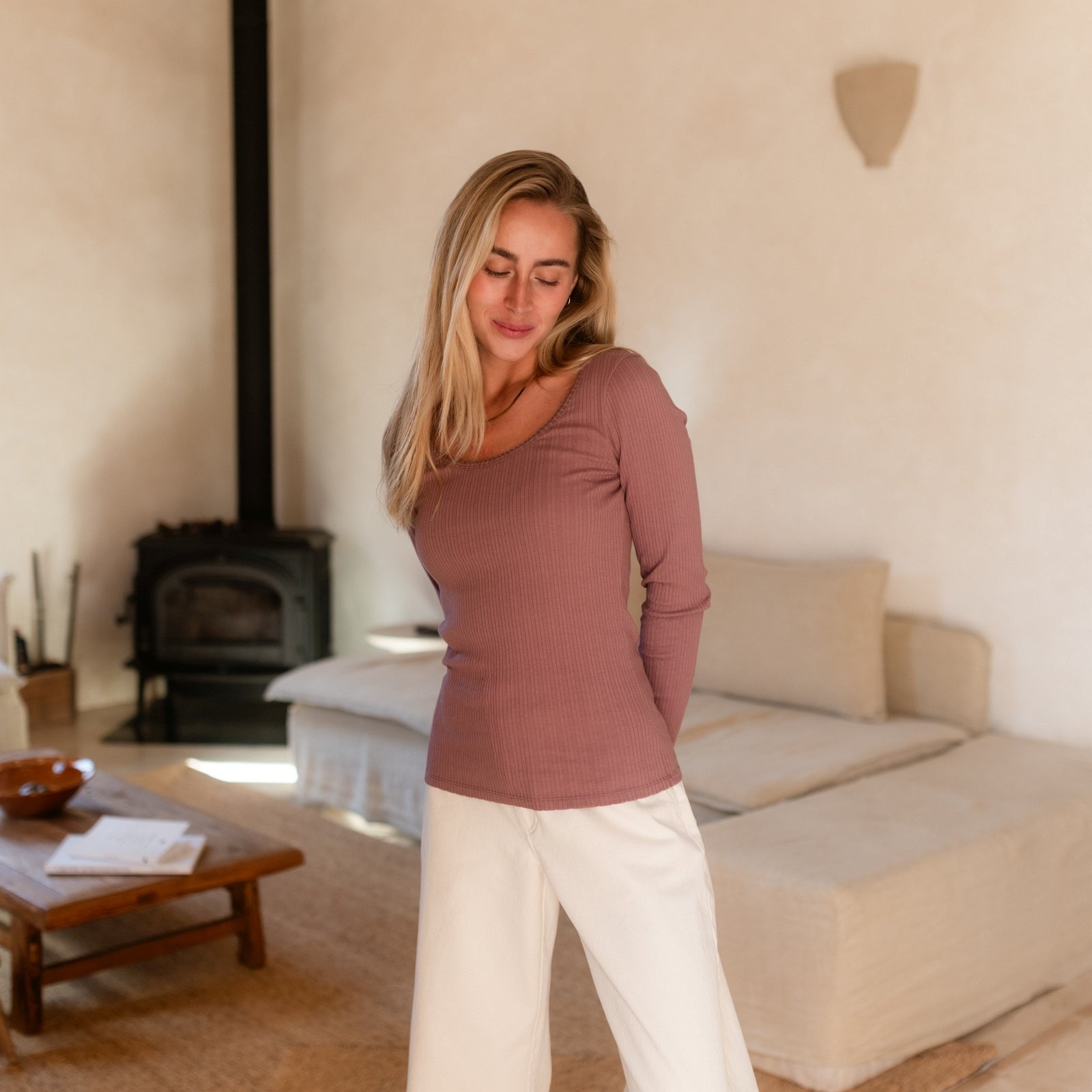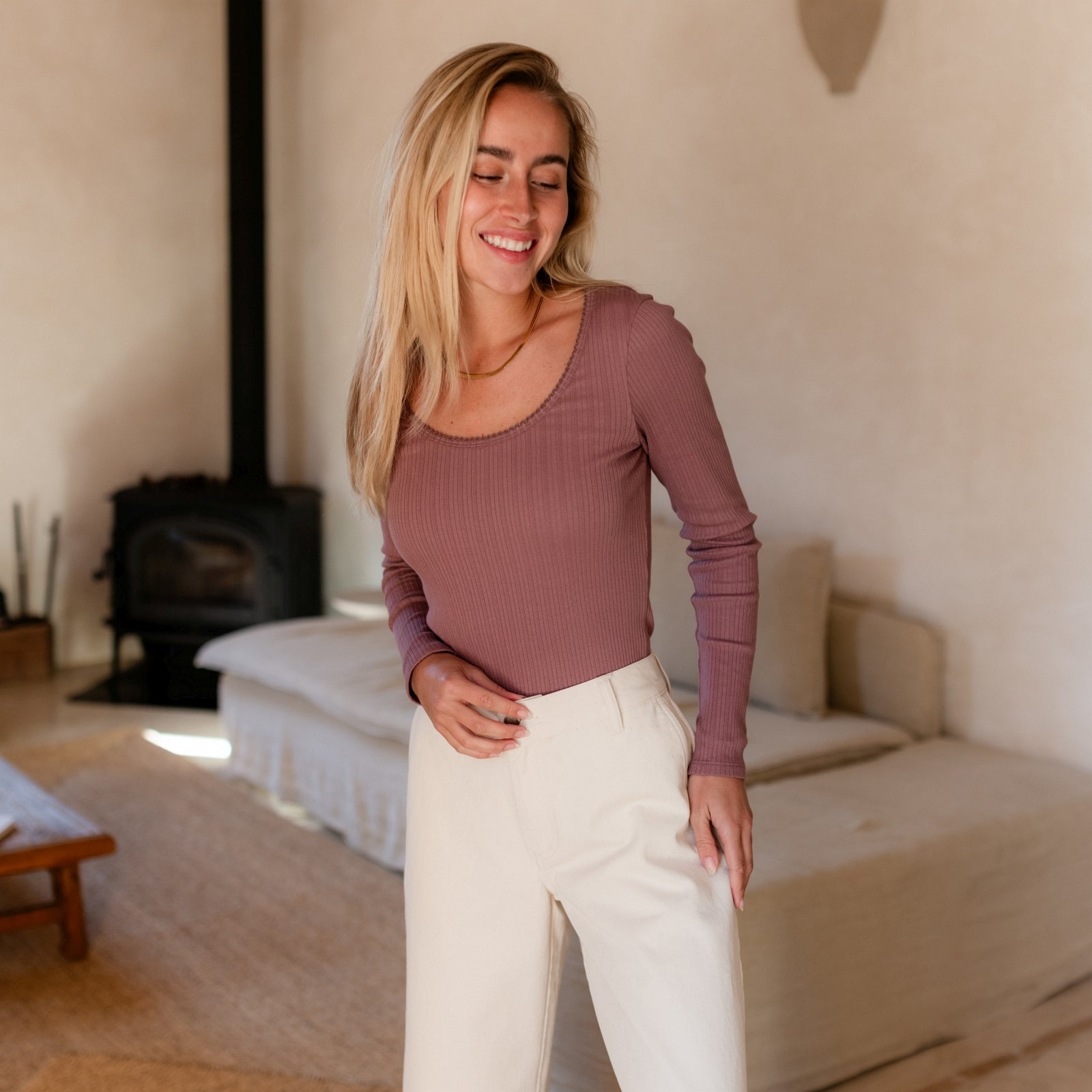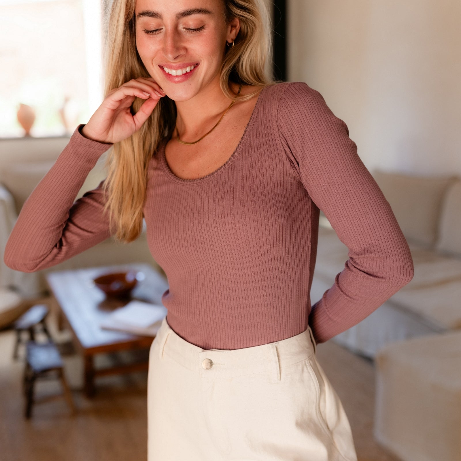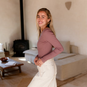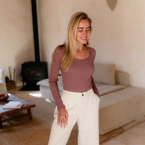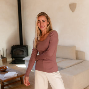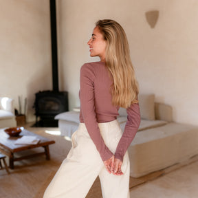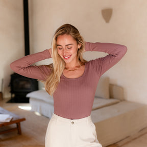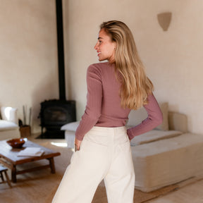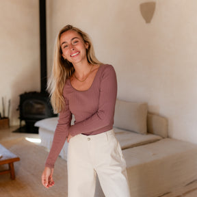 Das gerippte Nordlicht Langarmshirt Inga verbindet romantische Details mit natürlichem Komfort. Der tiefe Ausschnitt mit feinem Trim setzt einen femininen Akzent, während der körpernahe Schnitt deine Silhouette sanft unterstreicht. Das weiche Rippmaterial mit zartem Pointelle Muster aus Bio-Baumwolle liegt angenehm auf der Haut und sorgt für ein leichtes, komfortables Tragegefühl. Ein vielseitiges Longsleeve, das sich wunderbar zu Rock, Hose oder unter Strick kombinieren lässt.