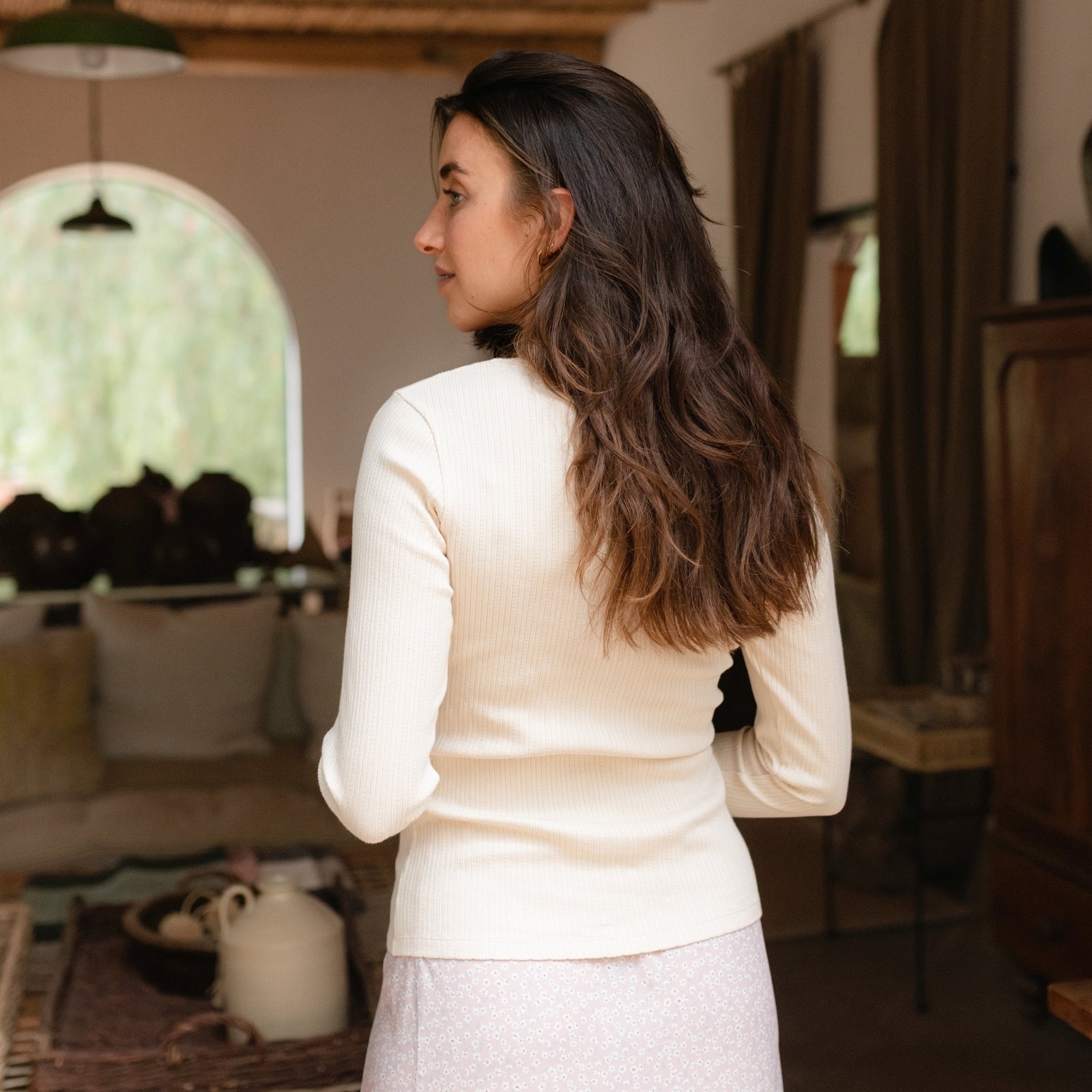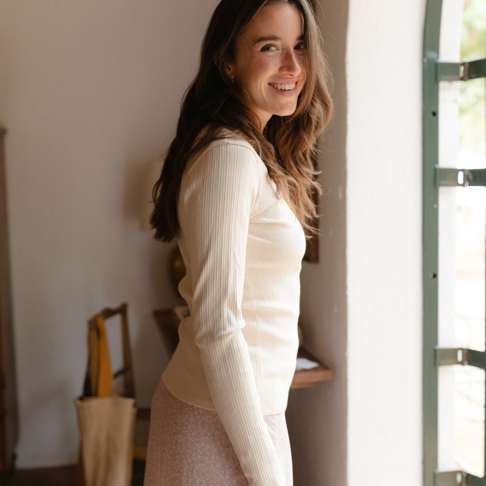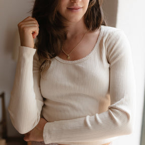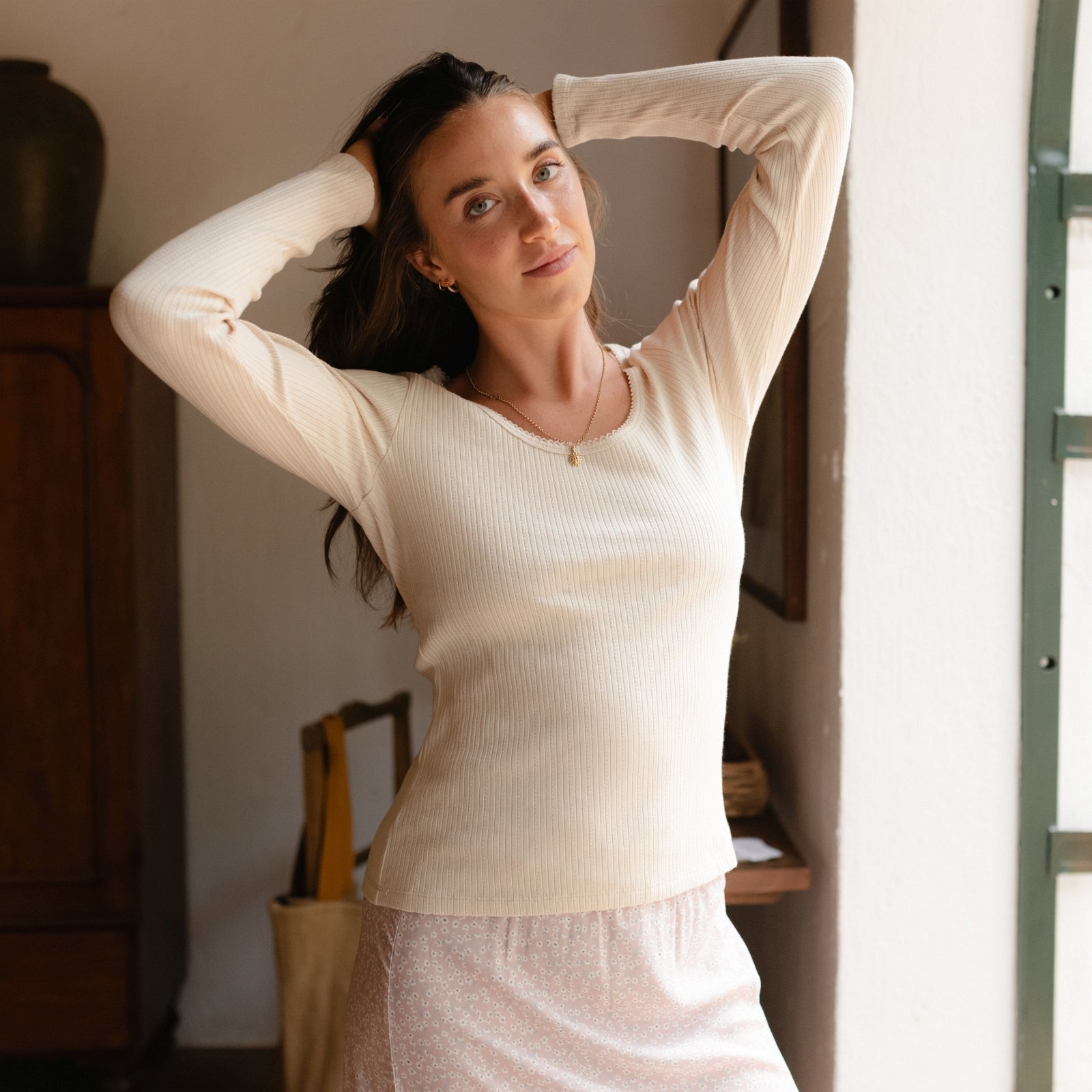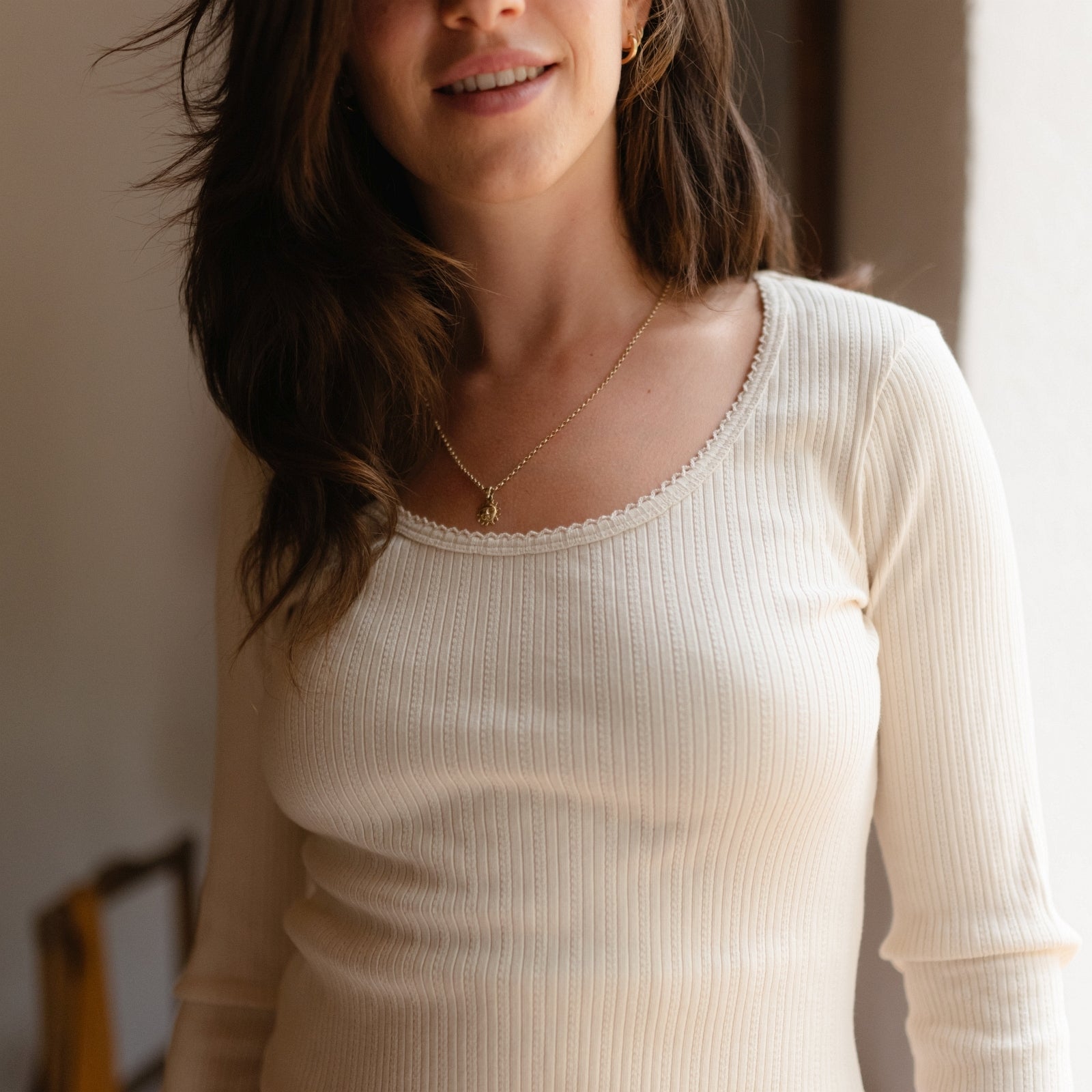 Das gerippte Nordlicht Langarmshirt Inga verbindet romantische Details mit natürlichem Komfort. Der tiefe Ausschnitt mit feinem Trim setzt einen femininen Akzent, während der körpernahe Schnitt deine Silhouette sanft unterstreicht. Das weiche Rippmaterial mit zartem Pointelle Muster aus Bio-Baumwolle liegt angenehm auf der Haut und sorgt für ein leichtes, komfortables Tragegefühl. Ein vielseitiges Longsleeve, das sich wunderbar zu Rock, Hose oder unter Strick kombinieren lässt.
