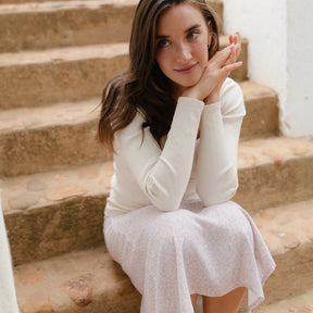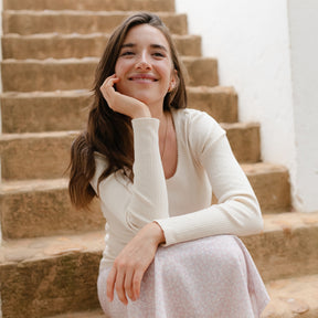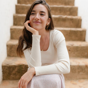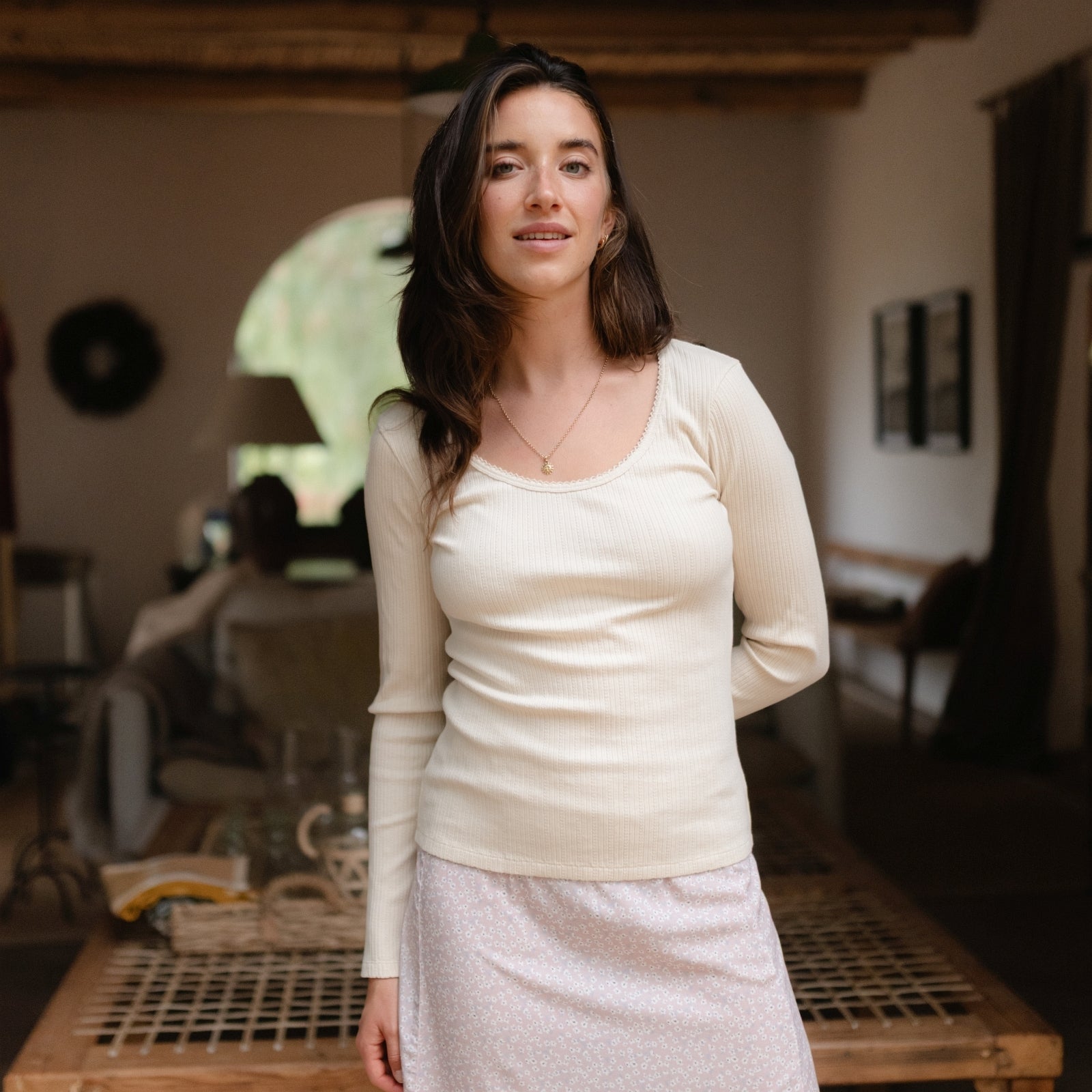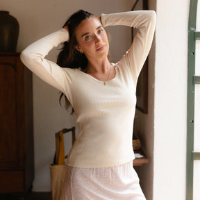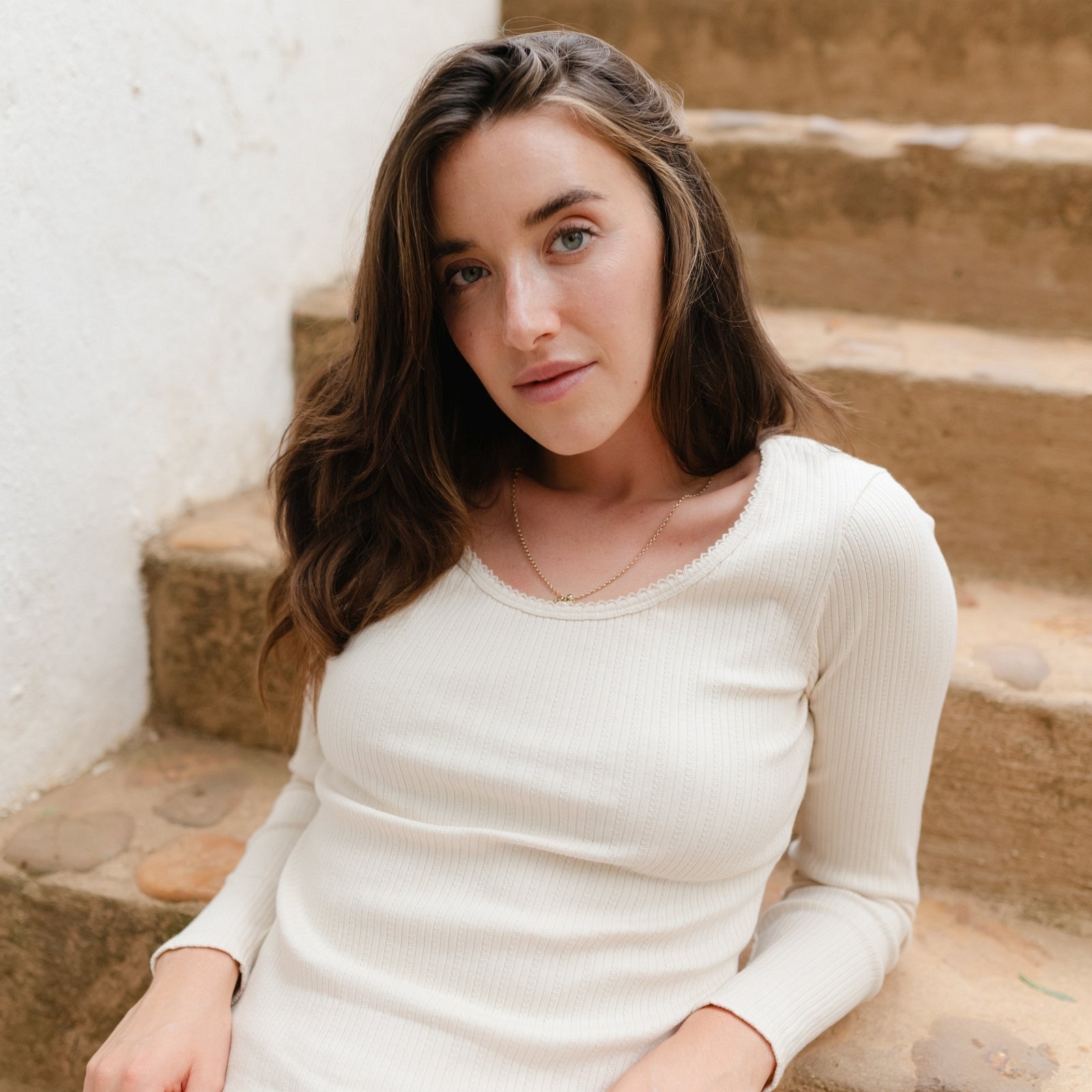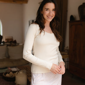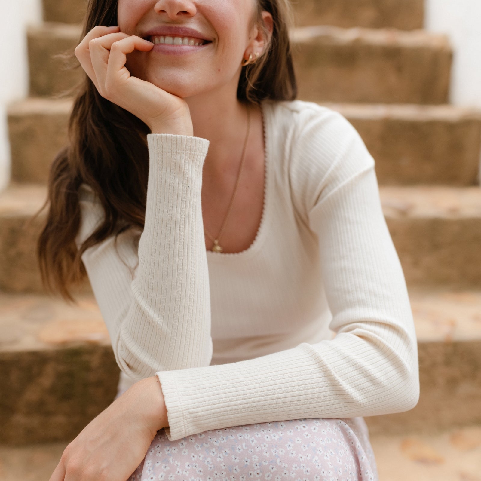 Das gerippte Nordlicht Langarmshirt Inga verbindet romantische Details mit natürlichem Komfort. Der tiefe Ausschnitt mit feinem Trim setzt einen femininen Akzent, während der körpernahe Schnitt deine Silhouette sanft unterstreicht. Das weiche Rippmaterial mit zartem Pointelle Muster aus Bio-Baumwolle liegt angenehm auf der Haut und sorgt für ein leichtes, komfortables Tragegefühl. Ein vielseitiges Longsleeve, das sich wunderbar zu Rock, Hose oder unter Strick kombinieren lässt.