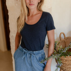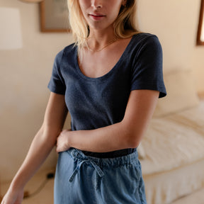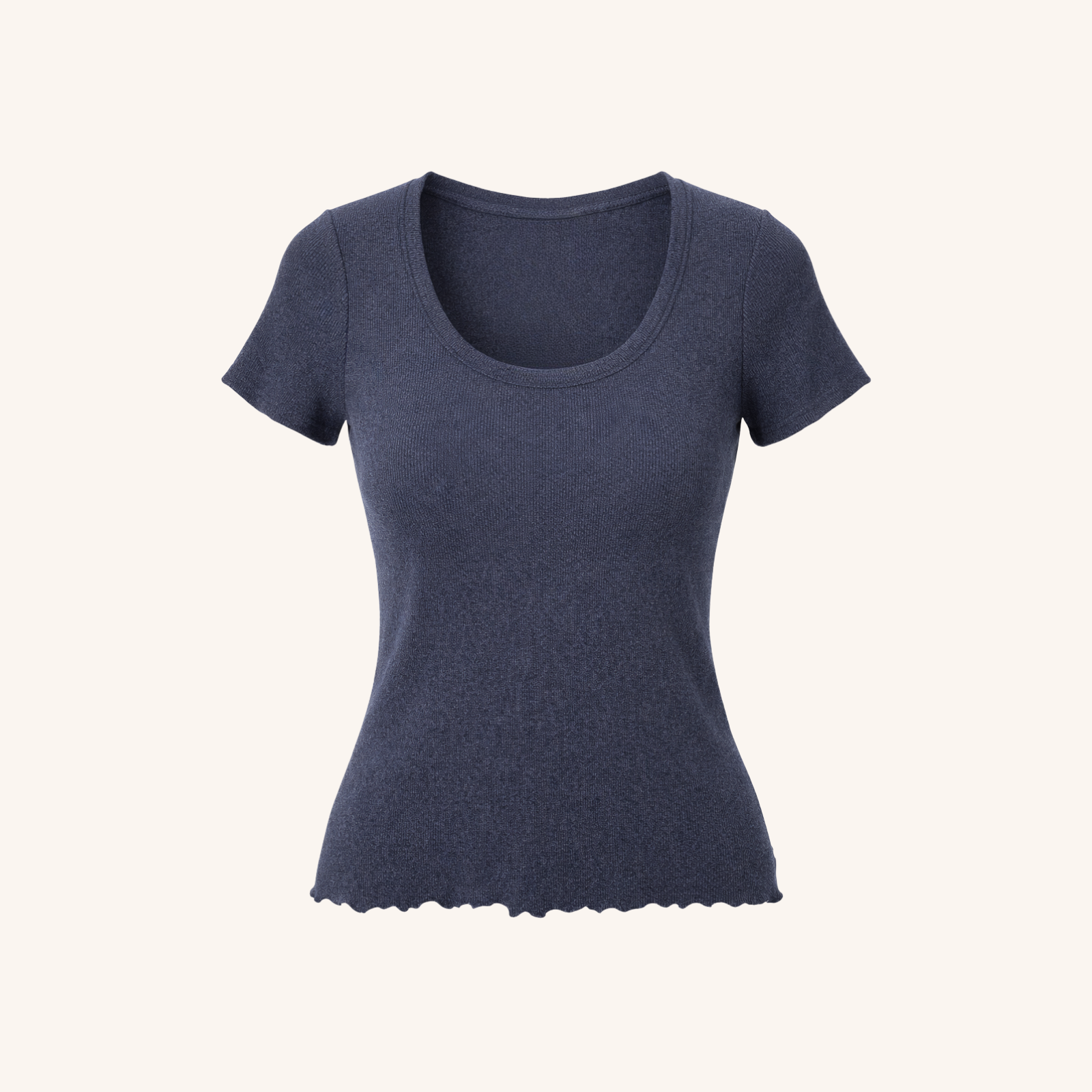 Stoff aus Bio-BaumwolleDas Nordlicht Ripp T-Shirt Evi bringt feminine Details und nachhaltigen Komfort in Einklang. Gefertigt aus weichem Rippmaterial liegt es angenehm auf der Haut und passt sich durch den enganliegenden Schnitt optimal deiner Silhouette an. Der tiefe Ausschnitt und feine Rüschchen am Saum setzen dezente, verspielte Akzente, ohne den minimalistischen Look zu verlieren. Ein vielseitiges Basic – ideal für warme Tage oder als zarte Layering-Basis.