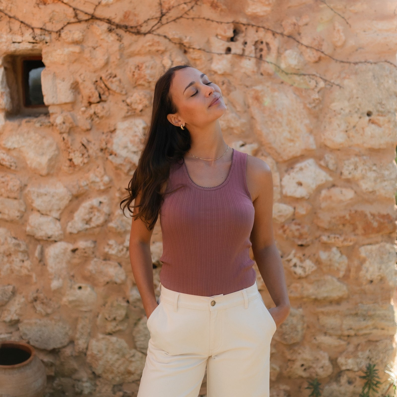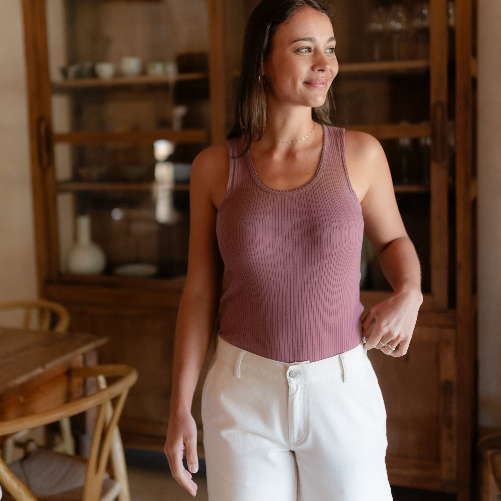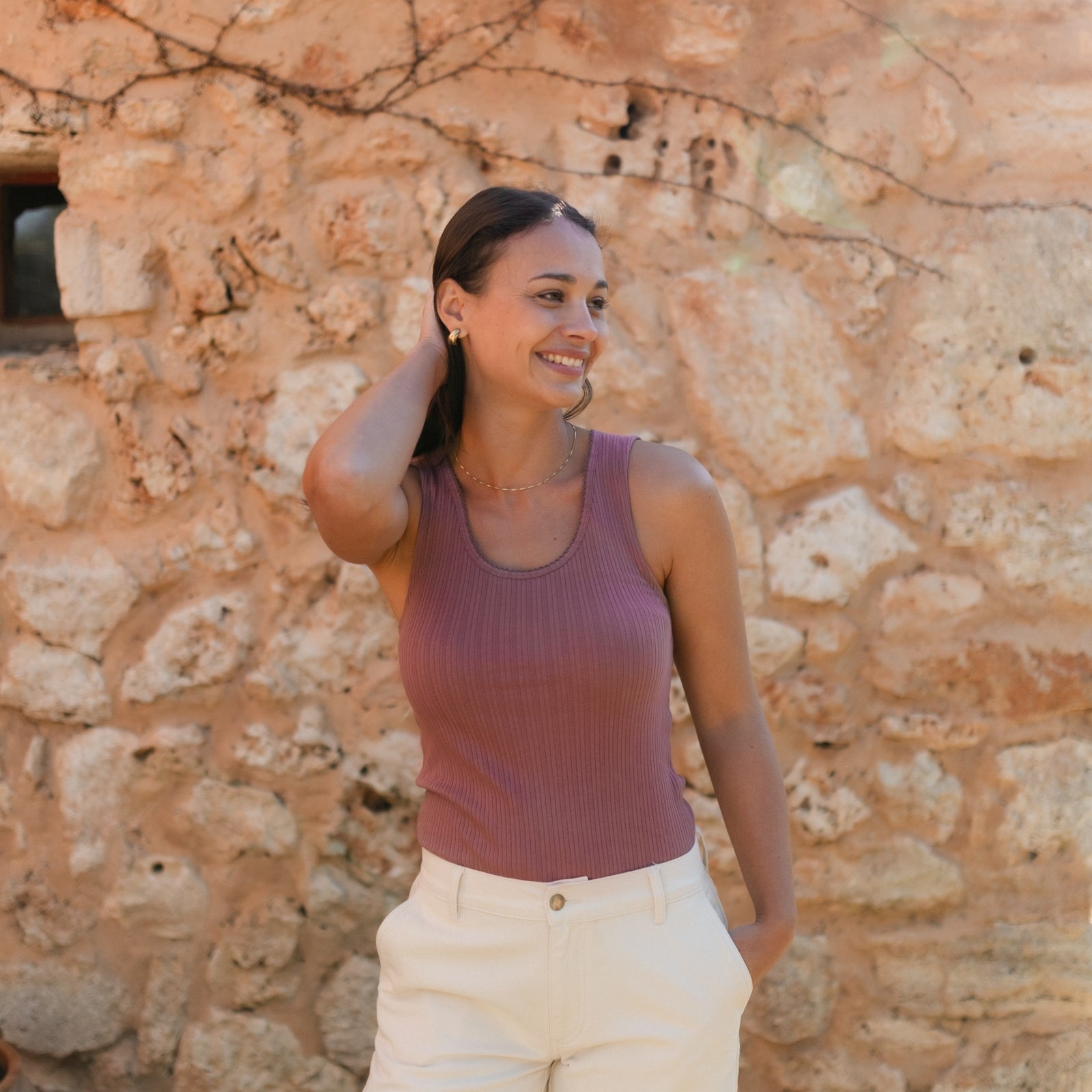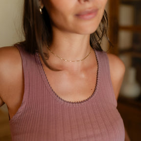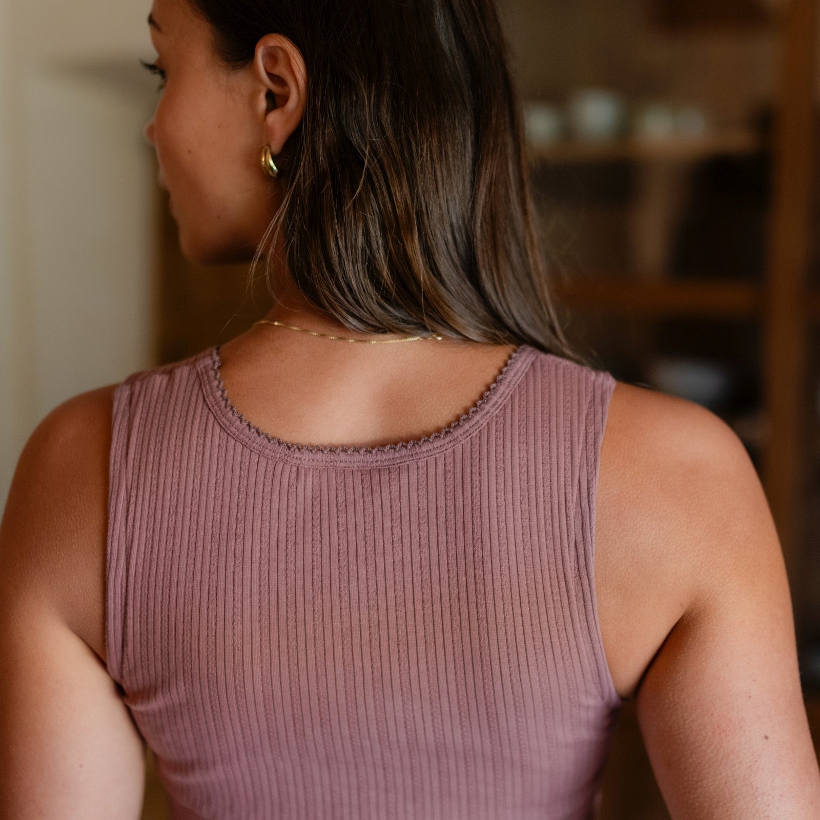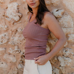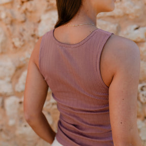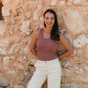 Das gerippte Nordlicht Top Anna verbindet feminine Details mit natürlichem Komfort. Der tiefe Ausschnitt mit feinem Trim verleiht dem Tanktop eine romantische Note, während der körpernahe Schnitt deine Silhouette sanft betont. Das weiche Rippmaterial mit zartem Pointelle Muster aus Bio-Baumwolle liegt angenehm auf der Haut und sorgt für ein leichtes, komfortables Tragegefühl. Ein vielseitiges Basic, das sich wunderbar solo tragen oder zum Layern kombinieren lässt.