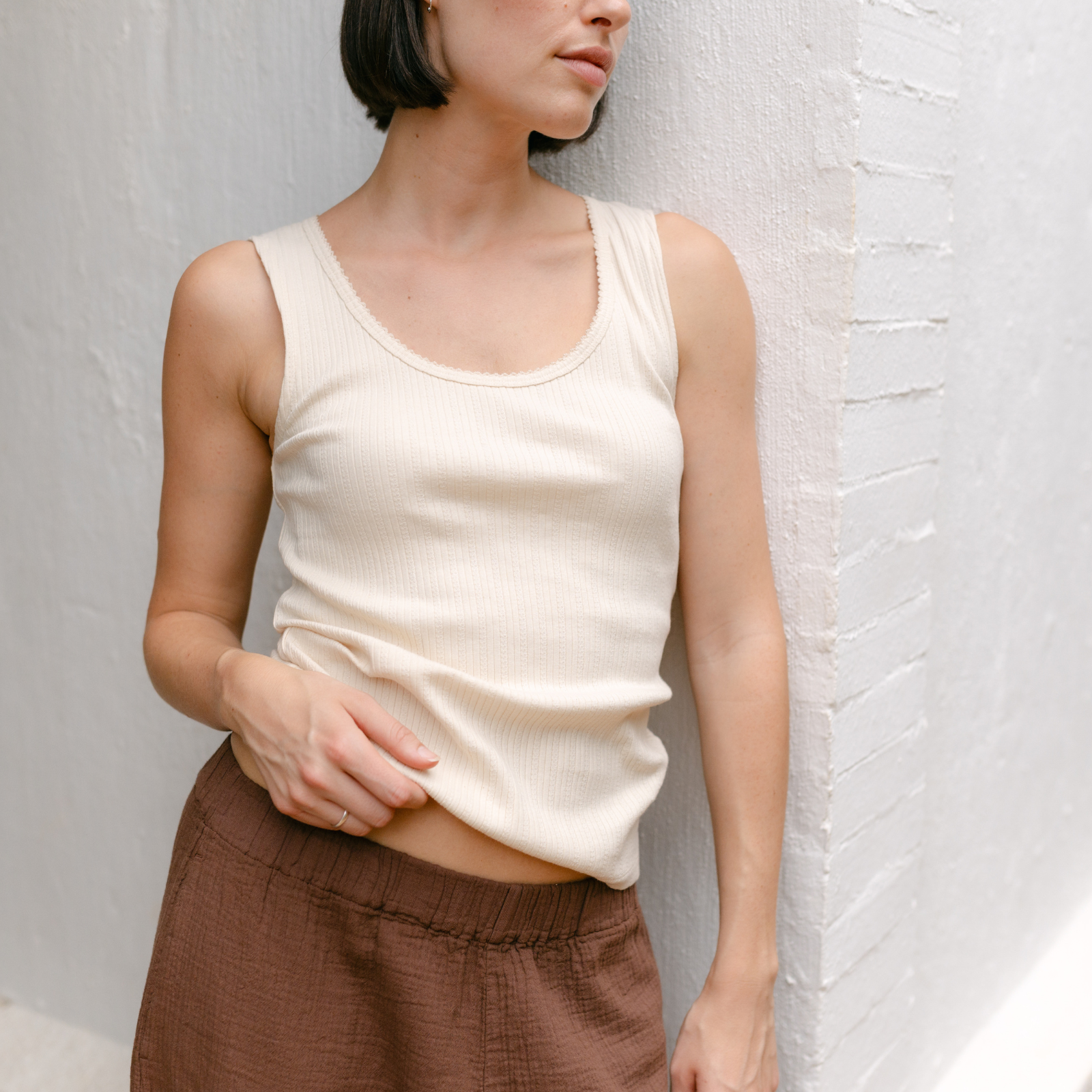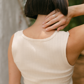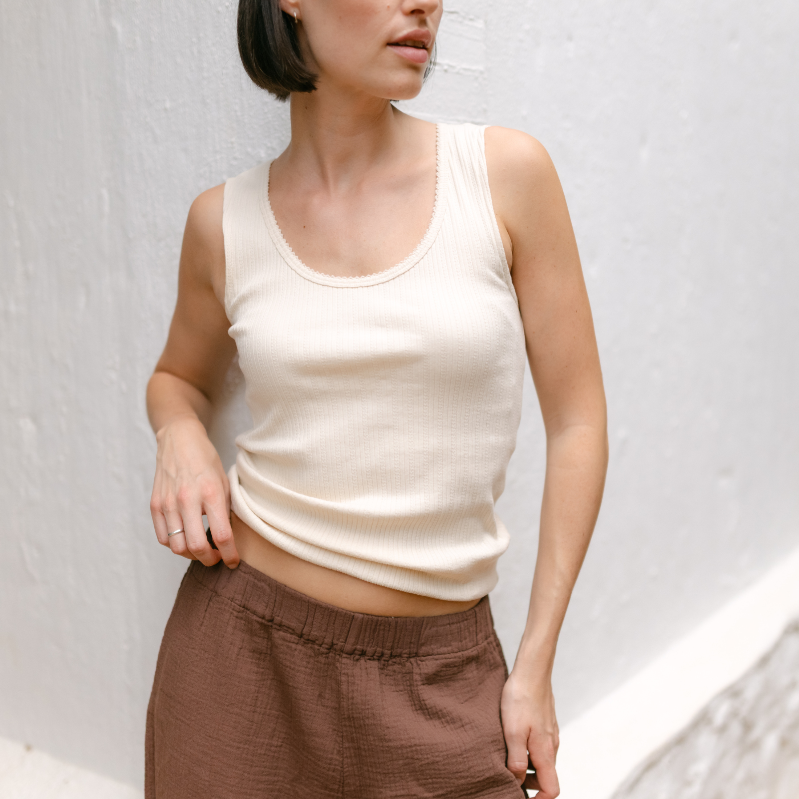 Das gerippte Nordlicht Top Anna verbindet feminine Details mit natürlichem Komfort. Der tiefe Ausschnitt mit feinem Trim verleiht dem Tanktop eine romantische Note, während der körpernahe Schnitt deine Silhouette sanft betont. Das weiche Rippmaterial mit zartem Pointelle Muster aus Bio-Baumwolle liegt angenehm auf der Haut und sorgt für ein leichtes, komfortables Tragegefühl. Ein vielseitiges Basic, das sich wunderbar solo tragen oder zum Layern kombinieren lässt.