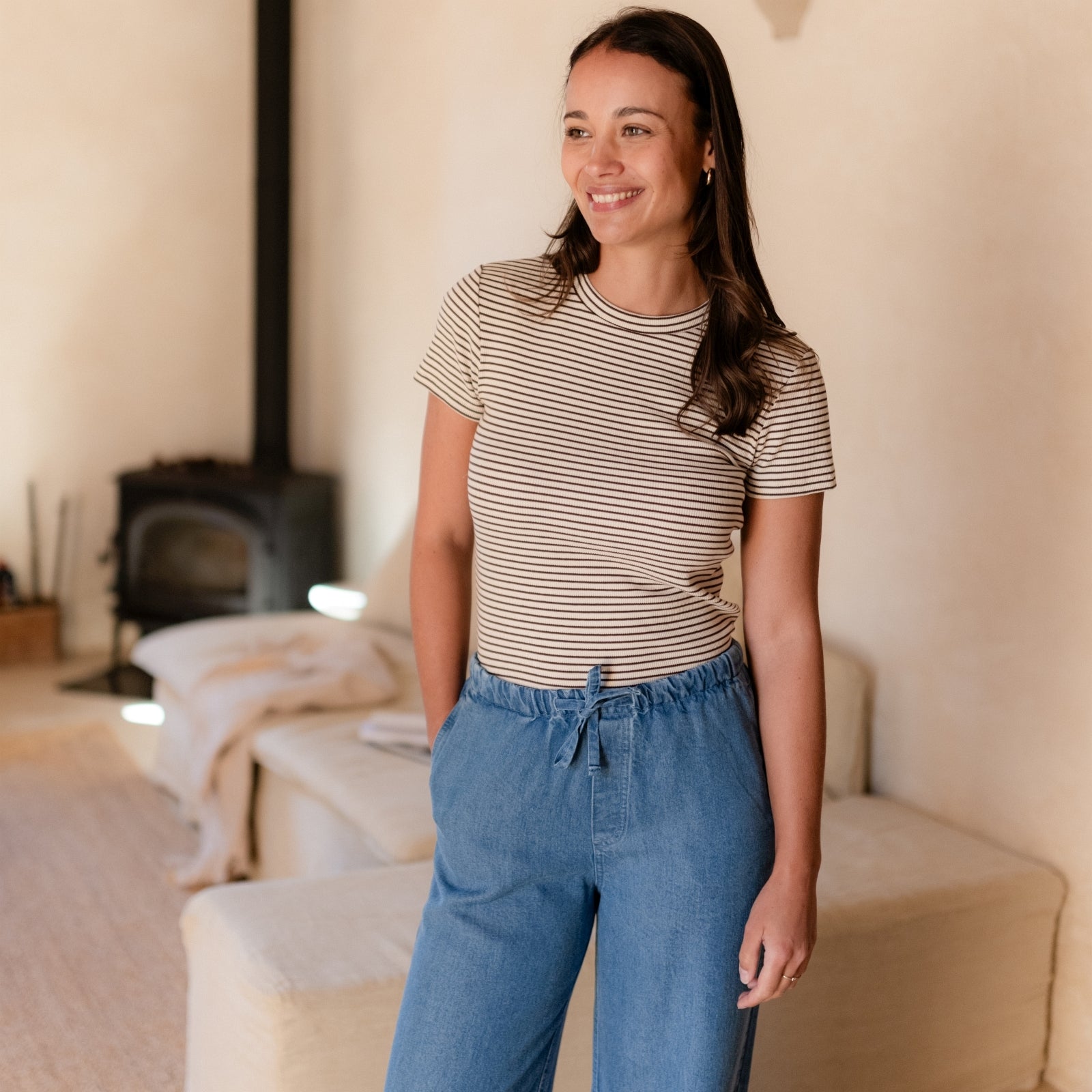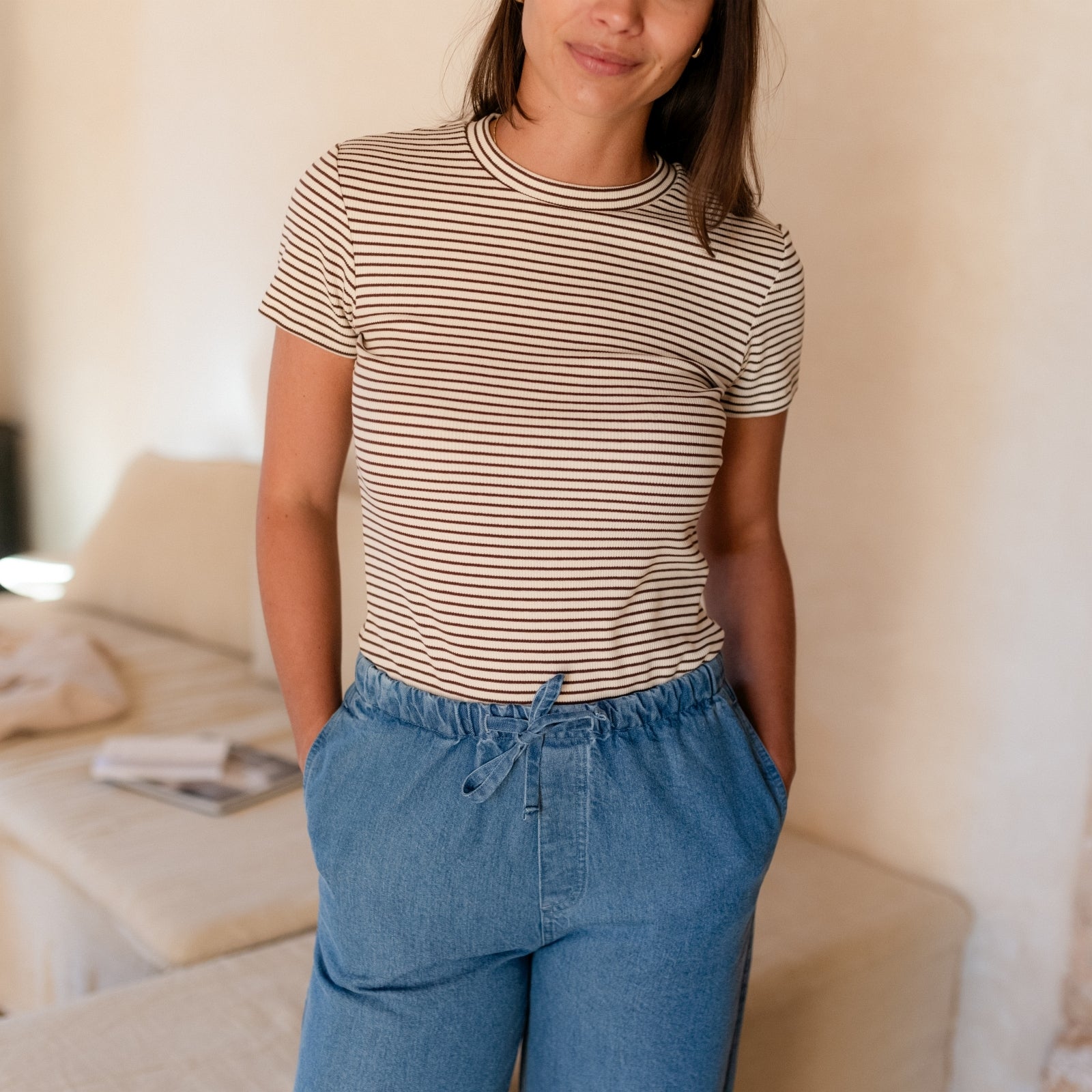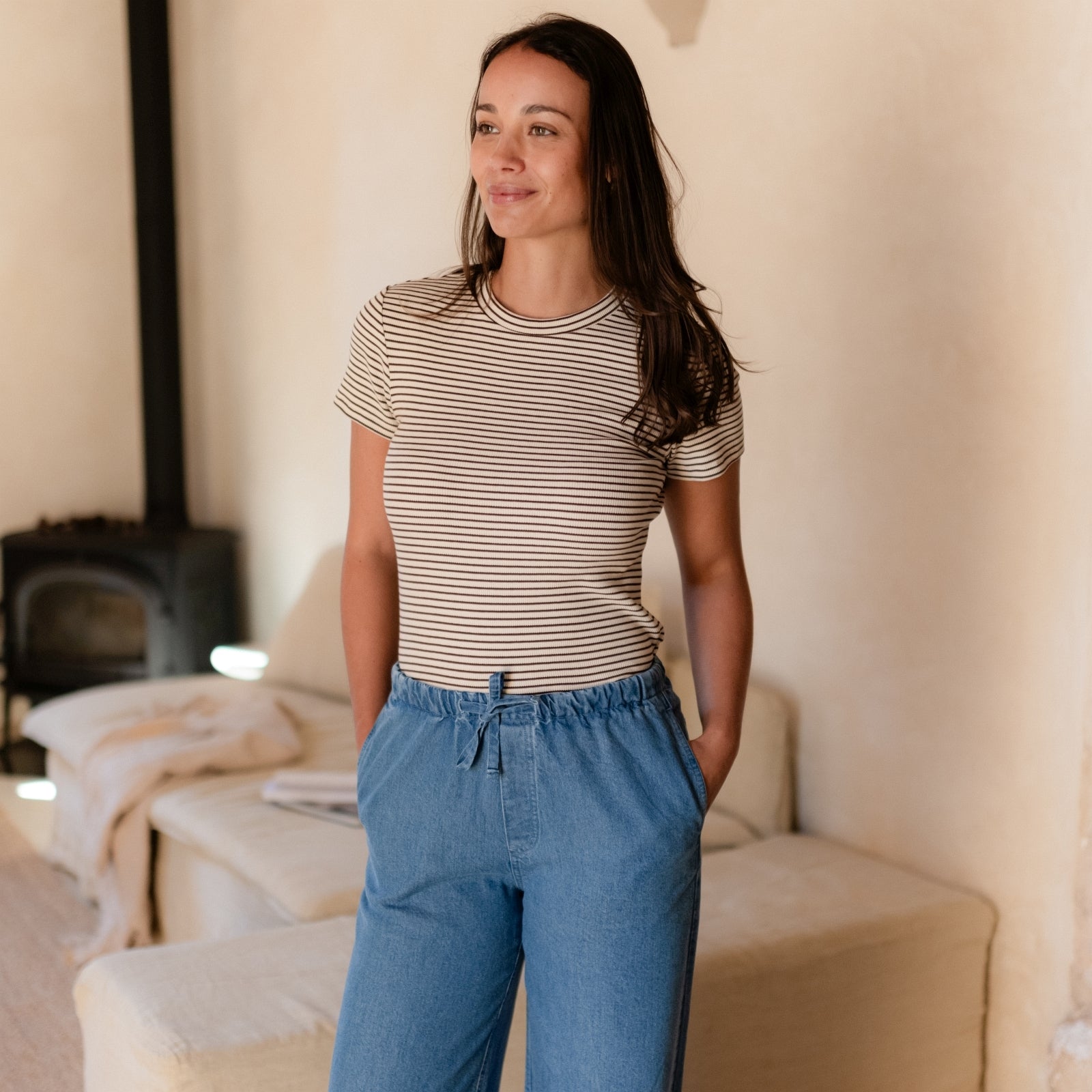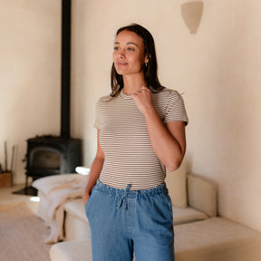 Stoff aus Bio-Baumwolle & KapokDas Nordlicht Ripp T-Shirt Elvie bringt sanfte Streifen und nachhaltigen Komfort in deine Garderobe. Gefertigt aus weichem Rippmaterial liegt Elvie angenehm auf der Haut und macht jede Bewegung mit – ganz ohne Einengen. Der enganliegende Schnitt und die kurzen Ärmel unterstreichen die feminine Silhouette – ein vielseitiges Basic für jeden Tag.