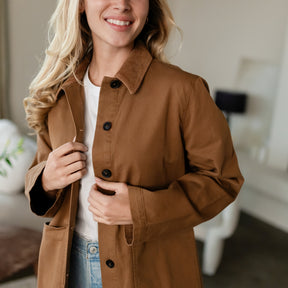 Stoff aus BaumwolleDie Nordlicht Jacke Tine verbindet zeitloses Design mit bewusst gewählten Materialien. Der lockere Schnitt sorgt für eine entspannte Silhouette, während aufgesetzte Taschen und eine klassische Knopfleiste den Look funktional und alltagstauglich machen. Ein Kordkragen ergänzt das Design und setzt einen charaktervollen Akzent. Corozo Knöpfe und die runde Nordlicht Stickerei auf der Tasche unterstreichen die hochwertigen Details dieser vielseitigen Jacke. Gefertigt aus einem Materialmix aus Bio-Baumwolle und recycelter Baumwolle verbindet Tine Komfort mit einem verantwortungsvollen Umgang mit Ressourcen.