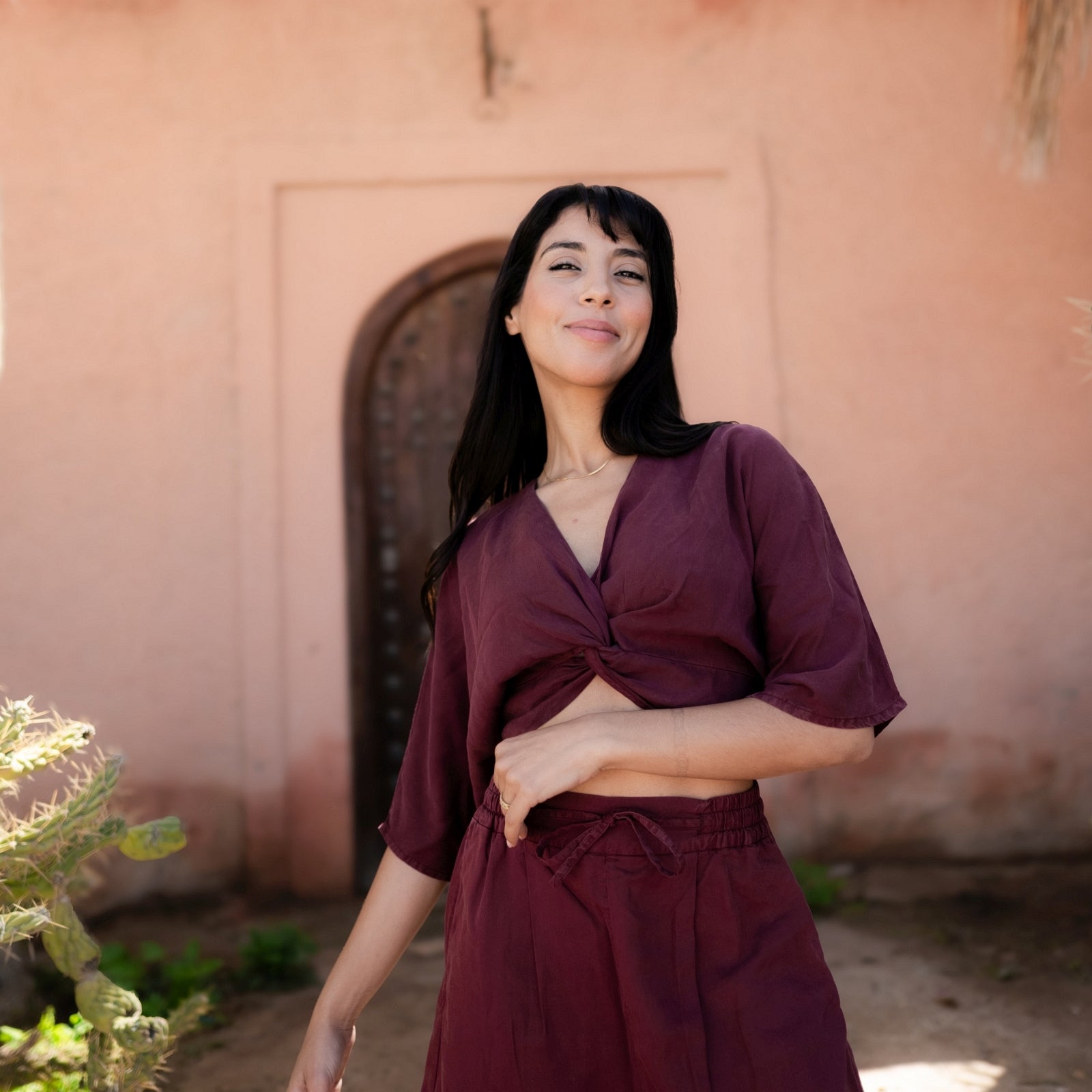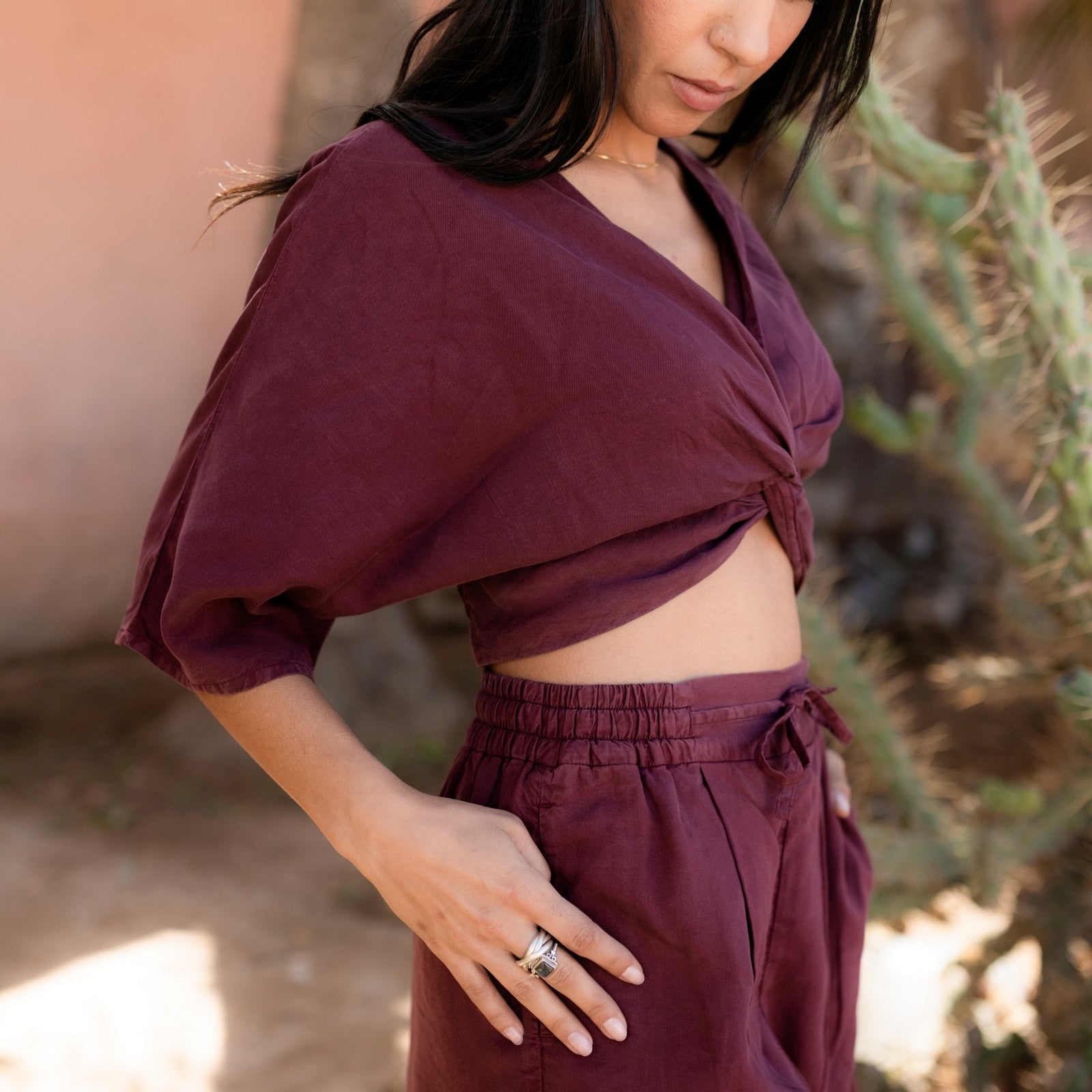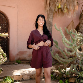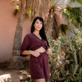 Das Knoten Crop Top in Bordeaux Rot ist perfekt für vielseitige Outfits. Kombiniere es mit unserer Tencel Highwaist Palazzo Hose für einen eleganten Look. Das weiche Material und der raffinierte Knoten am Saum betonen stilvoll deine Taille und sorgen für ein angenehmes Tragegefühl. Gefertigt aus hochwertigem Tencel, einem umweltfreundlichen Material, das aus nachhaltig gewonnenem Holz hergestellt wird, bietet dieses Crop Top außergewöhnlichen Tragekomfort.