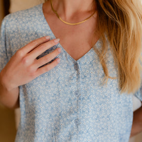Umweltfreundliche ViskosefaserDie Nordlicht Kurzarm Bluse Saga bringt romantische Leichtigkeit in deinen Alltag. Der feine Blumenprint verleiht ihr eine verspielte Note, während der fließende Stoff aus 100% Ecovero angenehm leicht auf der Haut liegt. Ein femininer V-Ausschnitt und die durchgehende Knopfleiste mit tonalen Corozo Buttons unterstreichen das hochwertige Design. Kurze Ärmel mit leichter Puffung sorgen für eine sanfte Silhouette und machen Saga zu einem vielseitigen Lieblingsstück – perfekt zu Jeans, Rock oder Leinenhose.