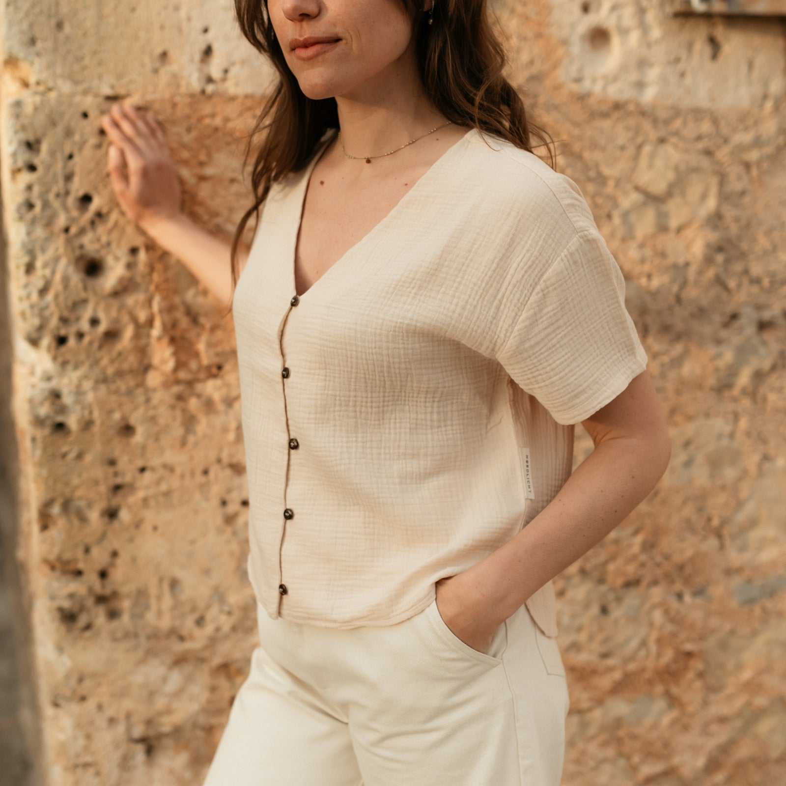 Pflege: Um die Langlebigkeit unserer Bluse zu gewährleisten, empfehlen wir, sie bei 30 Grad mit ähnlichen Farben zu waschen.