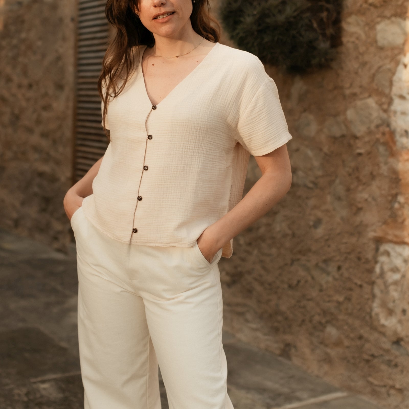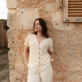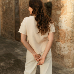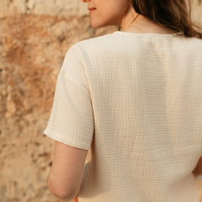 Musselin aus Bio-BaumwolleFREJA besteht zu 100% aus Bio-Baumwolle und ist handgefertigt in Barcelos, Portugal. Die Kurzarm Bluse eignet sich perfekt für einen lässigen Casual Look. Der Musselinstoff hat eine temperaturausgleichende Wirkung und dank der natürlichen Stoffstruktur entstehen keine Falten. Der gerade und kürzere Schnitt sorgt für Luftigkeit und gibt dir die Möglichkeit, das Shirt auch geknotet zu tragen.