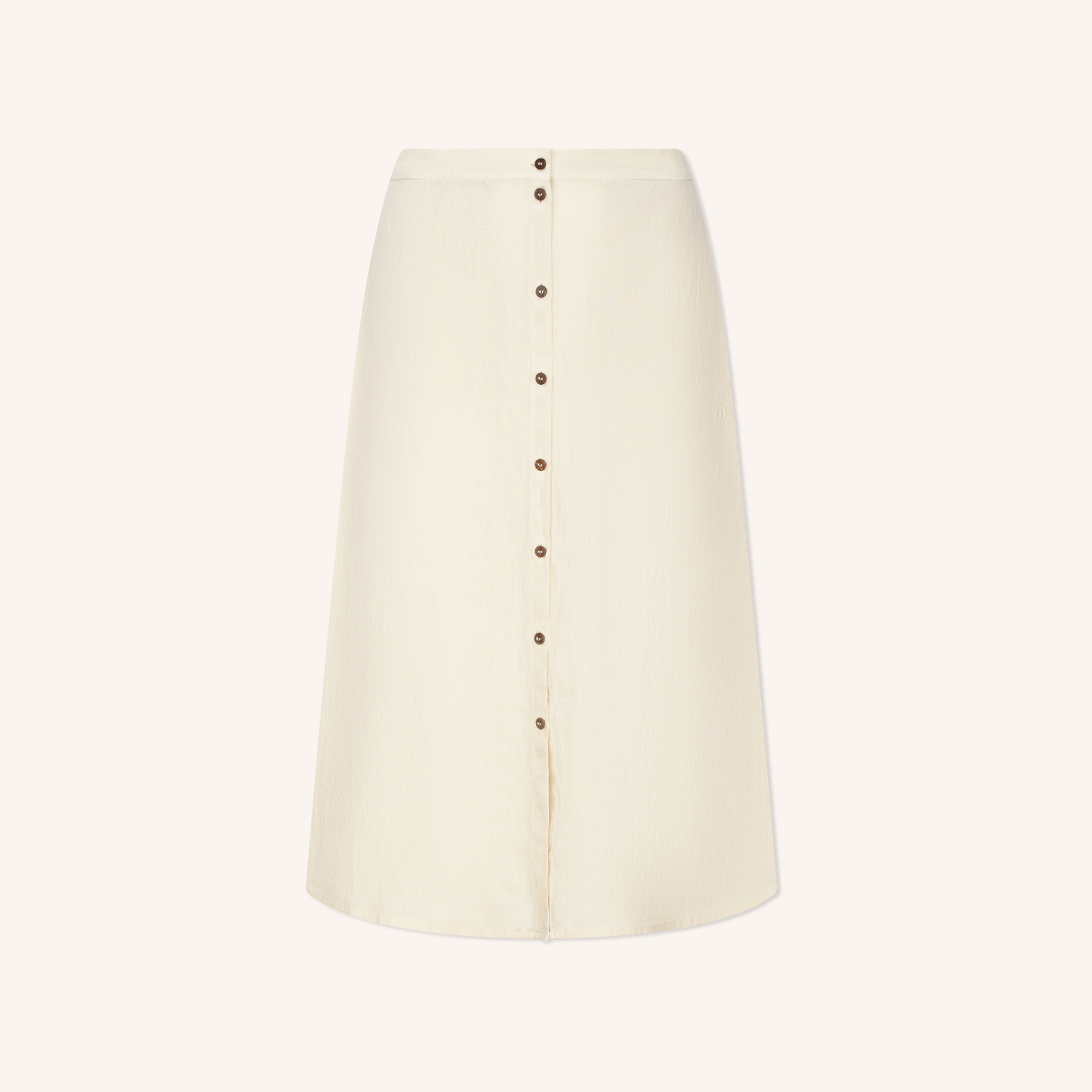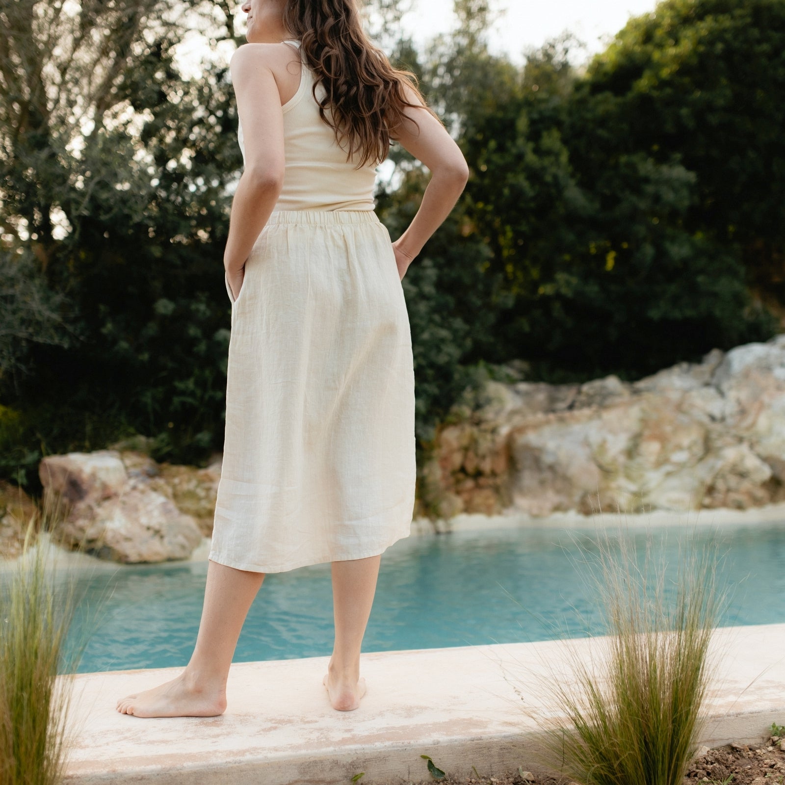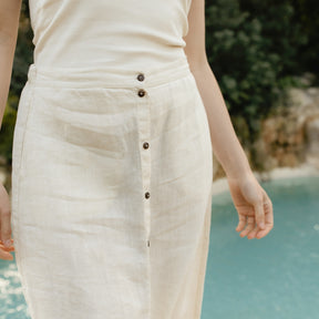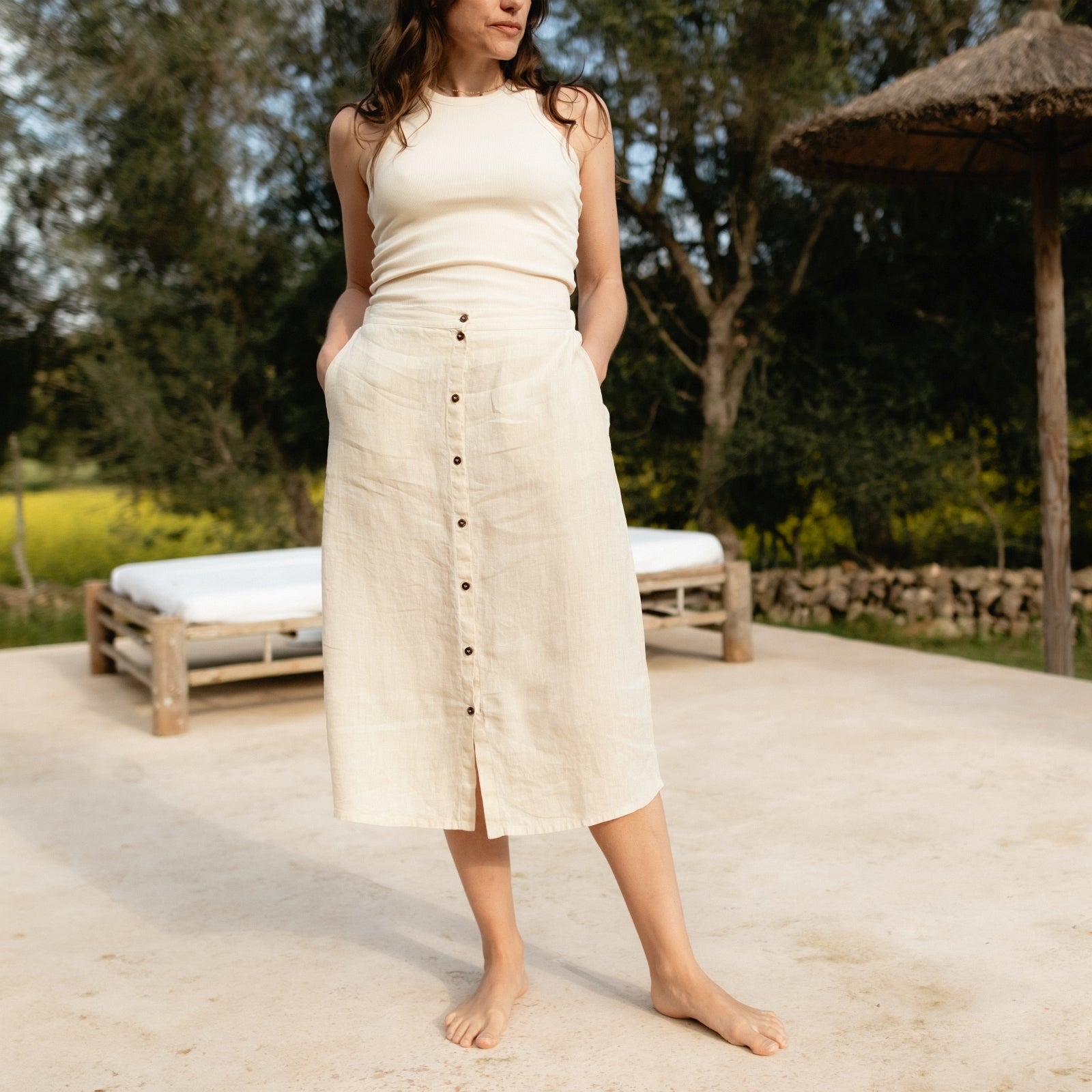 Unser Nordlicht Leinen Rock Alia vereint schlichte Eleganz mit sommerlicher Leichtigkeit. Gefertigt aus 100% Leinen, bietet er eine luftige und fließende Passform, die sich angenehm der Bewegung anpasst. Die Midi-Länge verleiht dem Rock eine zeitlose Silhouette, während die durchgehende Knopfleiste vorne, aus Knöpfen aus Kokosnussschalen, für ein natürliches und einzigartiges Detail sorgt. Ein elastisches Stück am hinteren Bund garantiert optimalen Tragekomfort und eine perfekte Passform. Praktische Seitentaschen machen Alia nicht nur stilvoll, sondern auch funktional – ideal für den Alltag und besondere Anlässe.