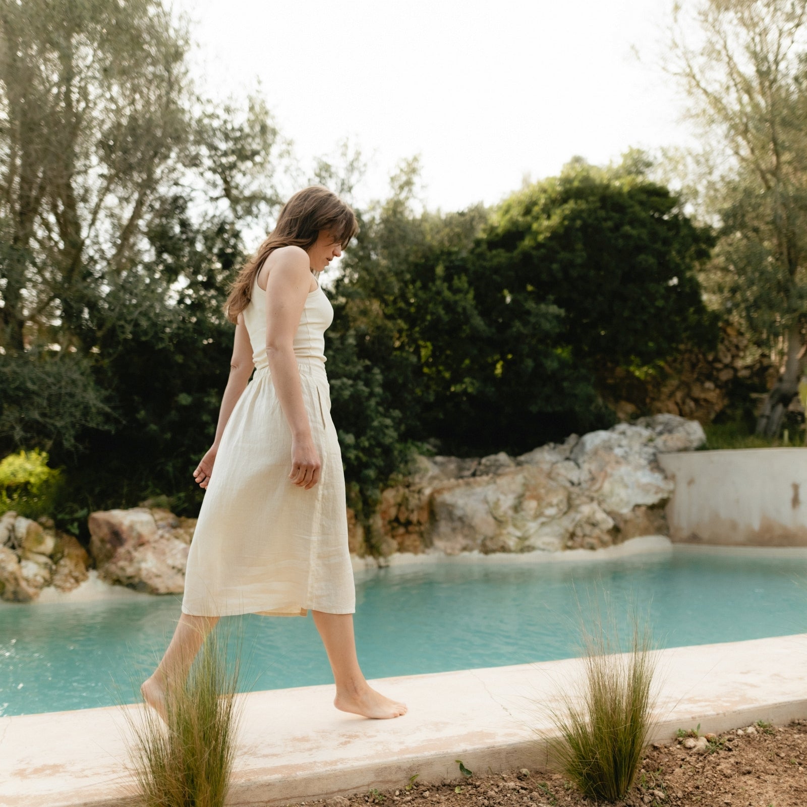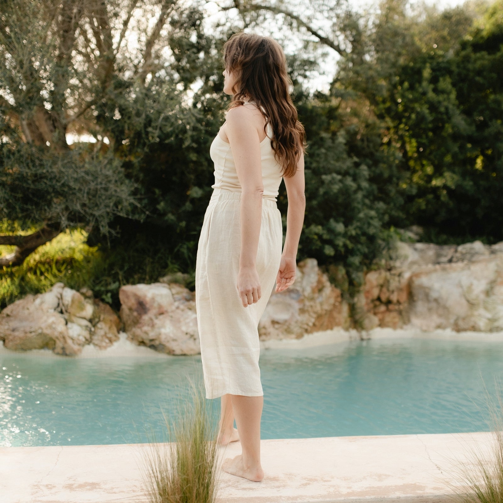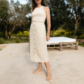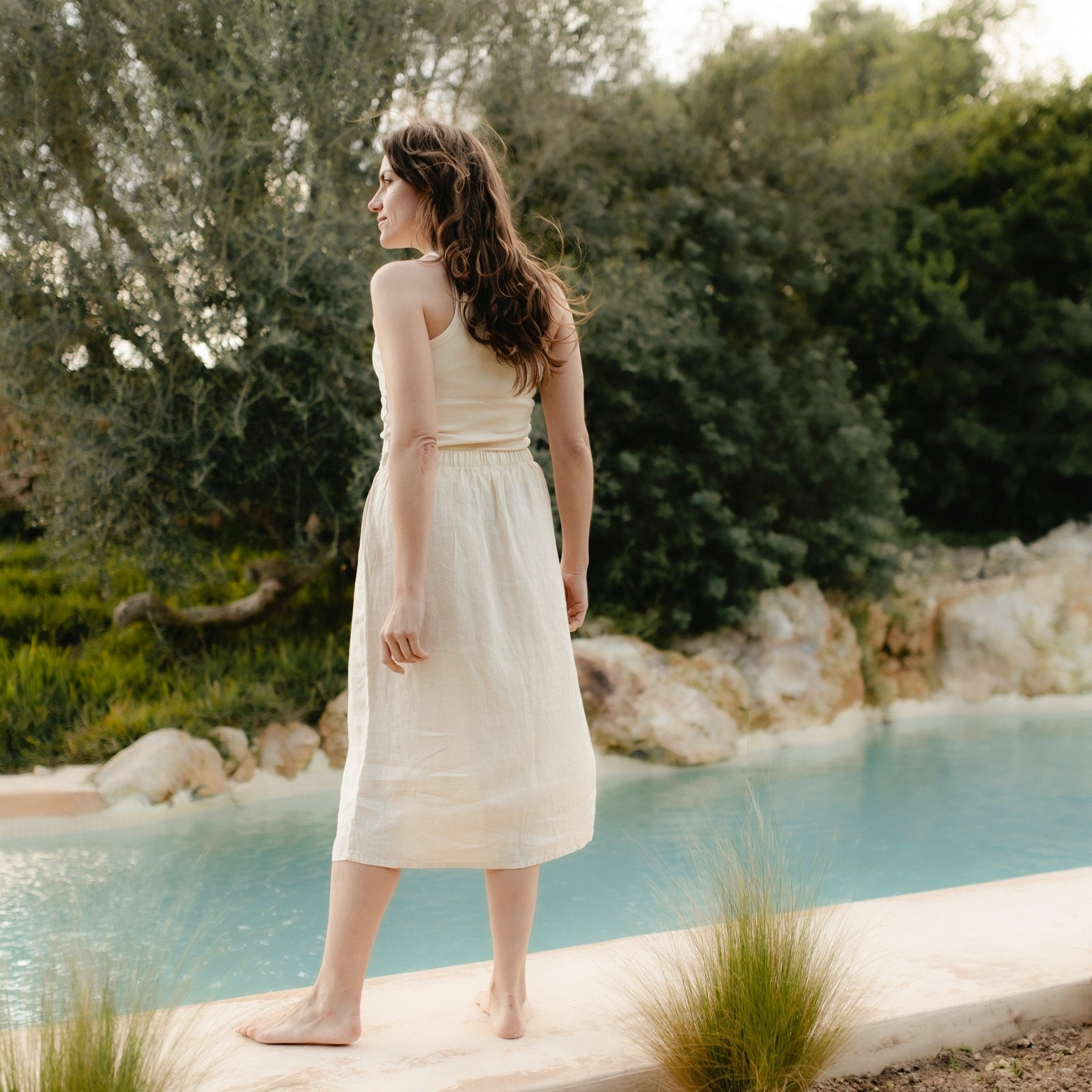 Unser Nordlicht Leinen Rock Alia vereint schlichte Eleganz mit sommerlicher Leichtigkeit. Gefertigt aus 100% Leinen, bietet er eine luftige und fließende Passform, die sich angenehm der Bewegung anpasst. Die Midi-Länge verleiht dem Rock eine zeitlose Silhouette, während die durchgehende Knopfleiste vorne, aus Knöpfen aus Kokosnussschalen, für ein natürliches und einzigartiges Detail sorgt. Ein elastisches Stück am hinteren Bund garantiert optimalen Tragekomfort und eine perfekte Passform. Praktische Seitentaschen machen Alia nicht nur stilvoll, sondern auch funktional – ideal für den Alltag und besondere Anlässe.