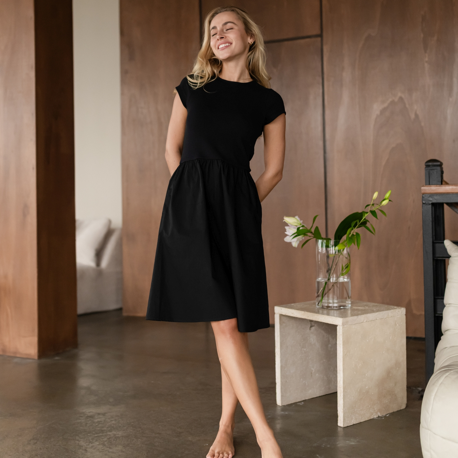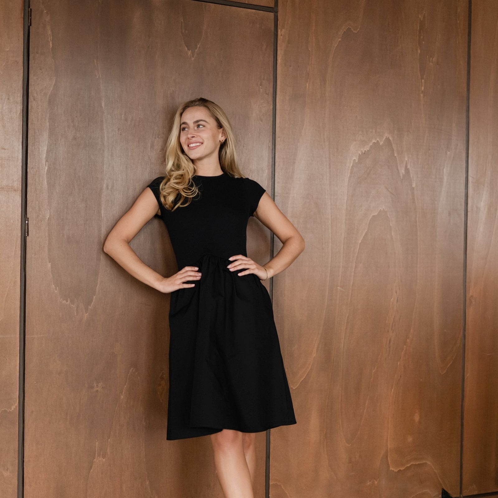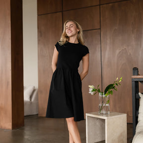 Materialien aus Bio-BaumwolleDas Nordlicht Mixed Media Kleid Gunda vereint zwei Materialien zu einem harmonischen Look. Das enganliegende Oberteil aus weichem Rippmaterial schmiegt sich angenehm an und sorgt mit kurzen Ärmeln für eine moderne, klare Silhouette. Der knielange Rock aus Baumwoll Poplin fällt locker und bringt Bewegung ins Design. Seitliche Taschen machen das Kleid alltagstauglich und bequem. Ein vielseitiges Lieblingsstück, das Komfort und zeitlosen Stil verbindet.