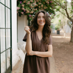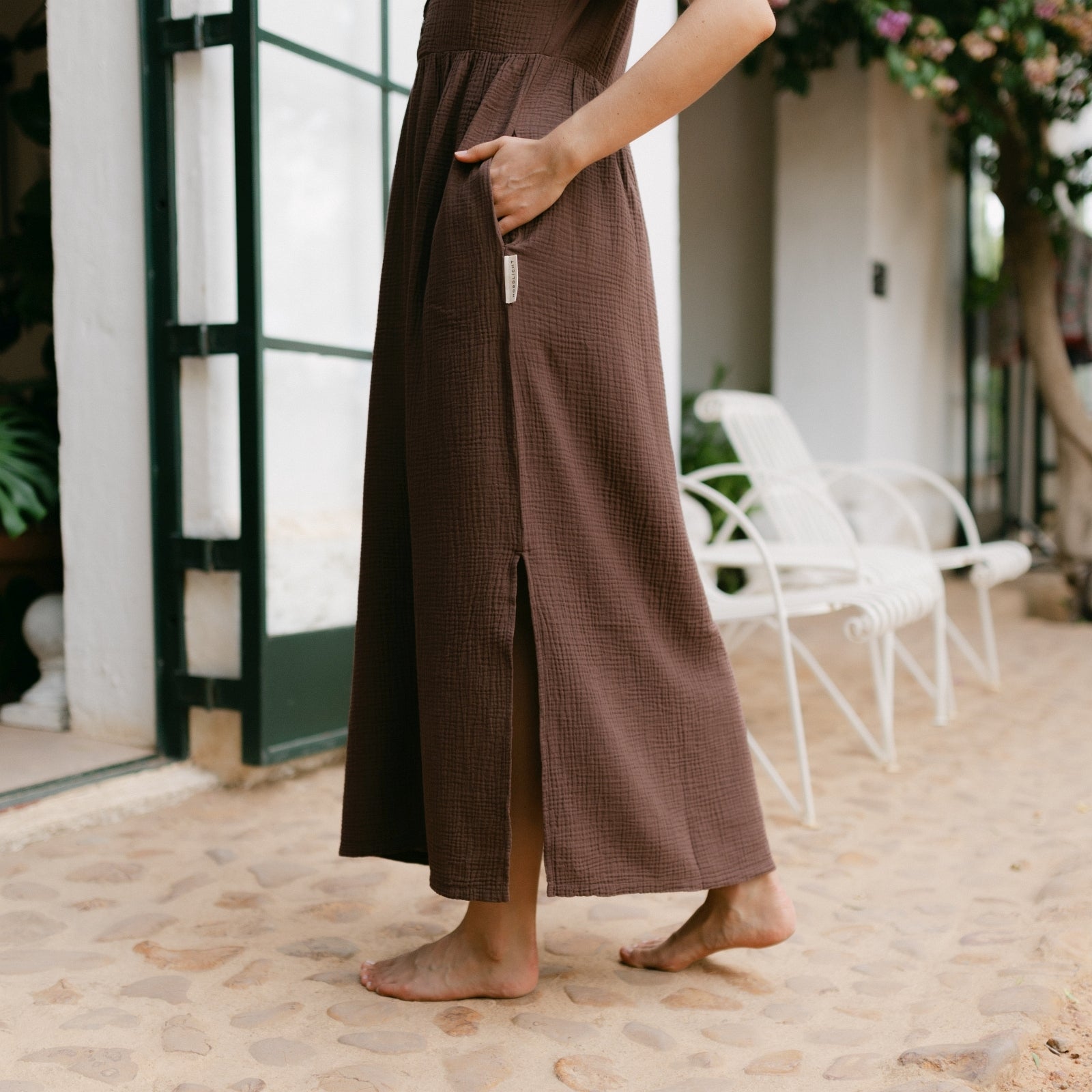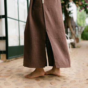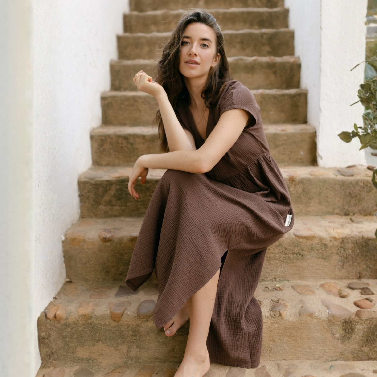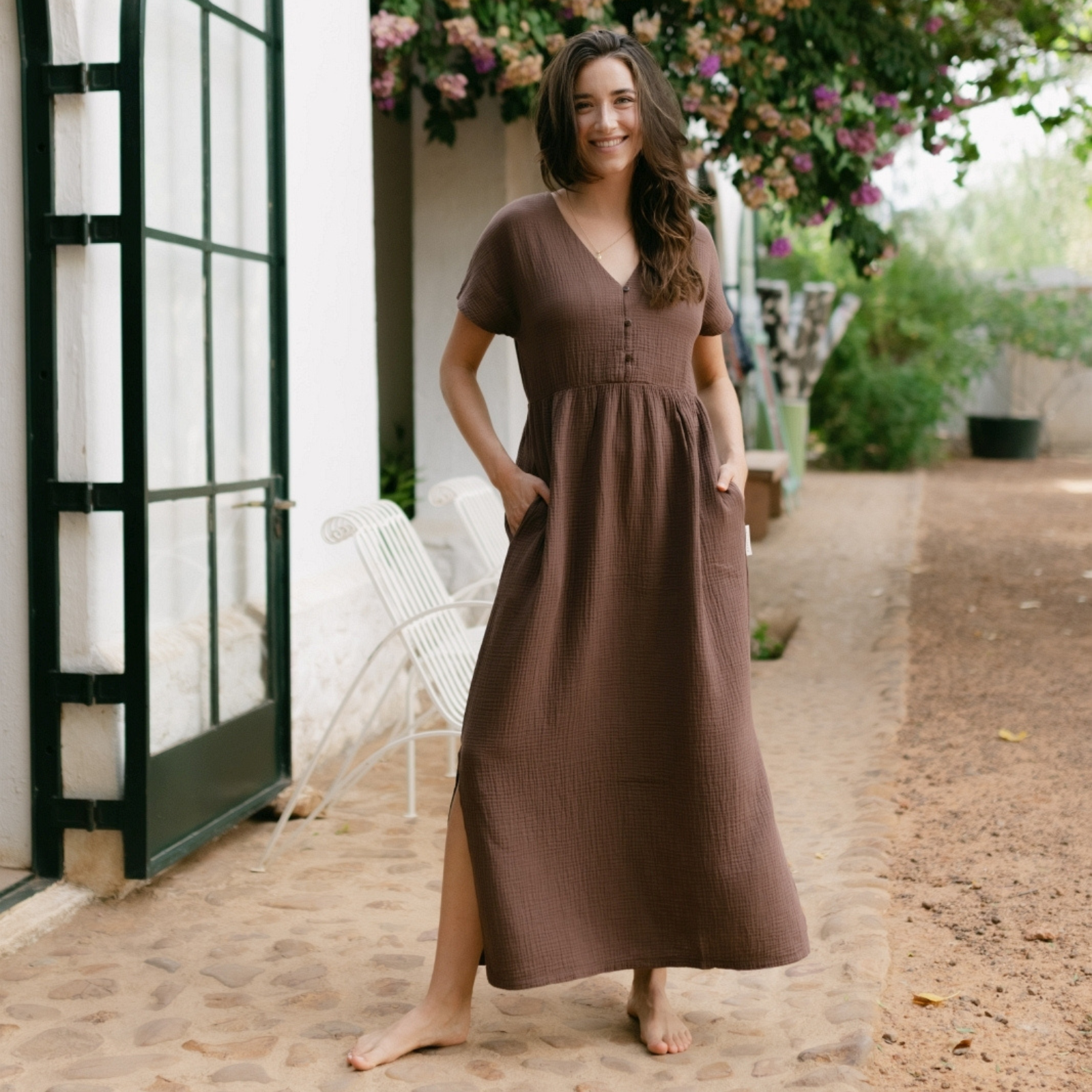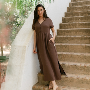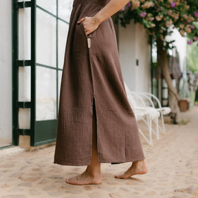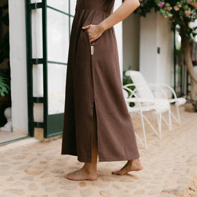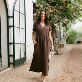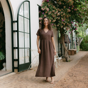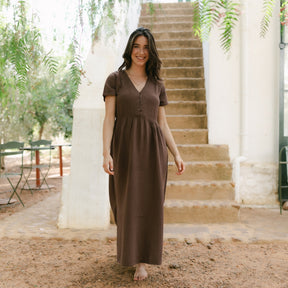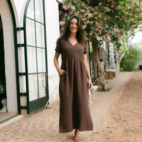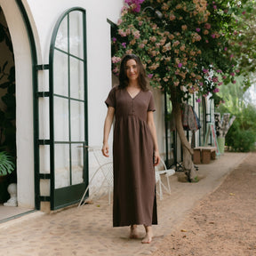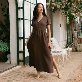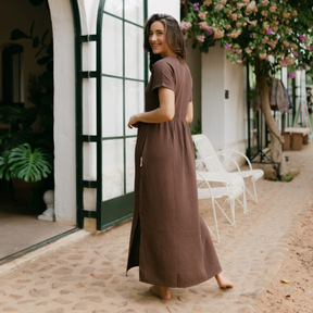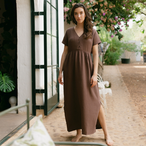 Musselin aus Bio-BaumwolleEuer Bestseller jetzt in Maxi-Länge: ALMA Lang in Braun ist leicht, luftig und stilvoll. Der weiche Musselin-Stoff aus 100 % Bio-Baumwolle fühlt sich angenehm an und fällt fließend – ganz ohne Faltenbildung. Seitliche Schlitze bieten zusätzliche Bewegungsfreiheit, während der feminine V-Ausschnitt mit nachhaltigen Knöpfen ein dezentes Highlight setzt. Perfekt für einen entspannten, eleganten Look.