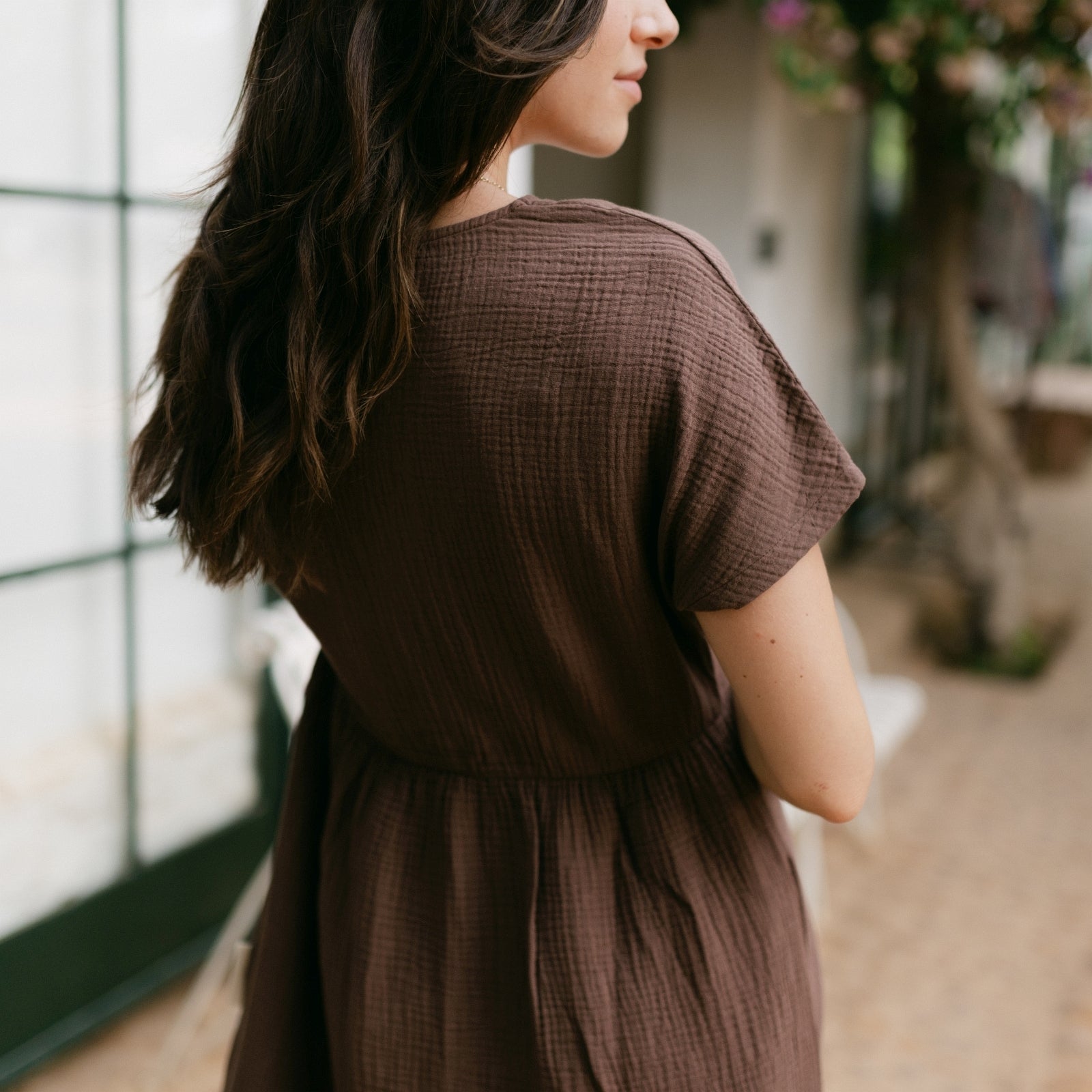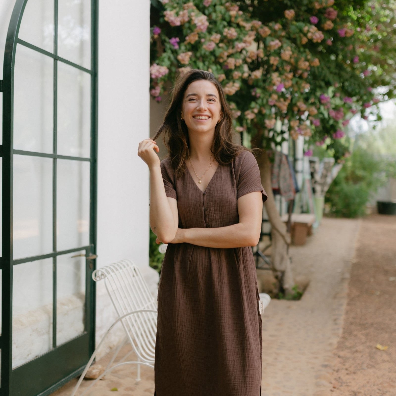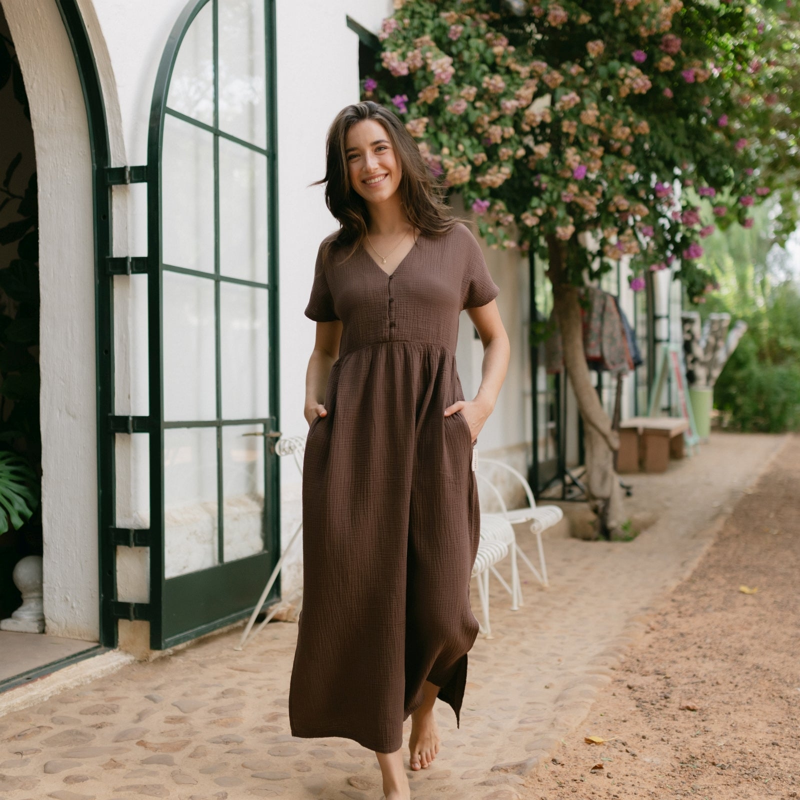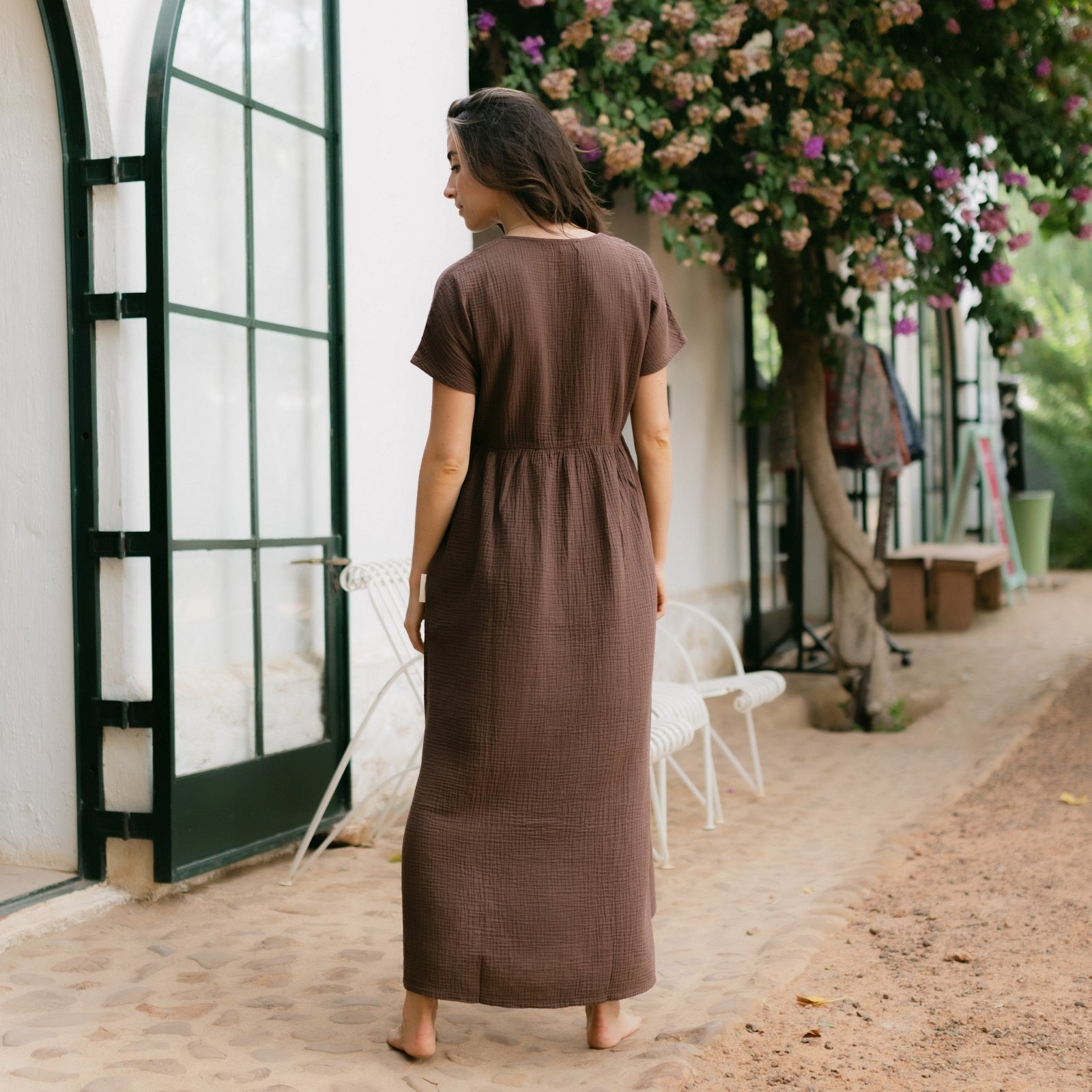 Musselin aus Bio-BaumwolleEuer Bestseller jetzt in Maxi-Länge: ALMA Lang in Braun ist leicht, luftig und stilvoll. Der weiche Musselin-Stoff aus 100 % Bio-Baumwolle fühlt sich angenehm an und fällt fließend – ganz ohne Faltenbildung. Seitliche Schlitze bieten zusätzliche Bewegungsfreiheit, während der feminine V-Ausschnitt mit nachhaltigen Knöpfen ein dezentes Highlight setzt. Perfekt für einen entspannten, eleganten Look.
