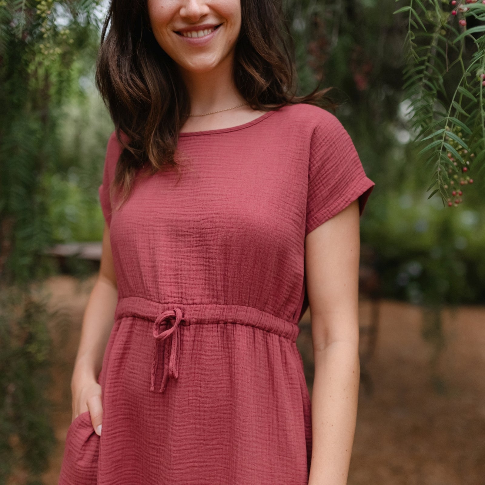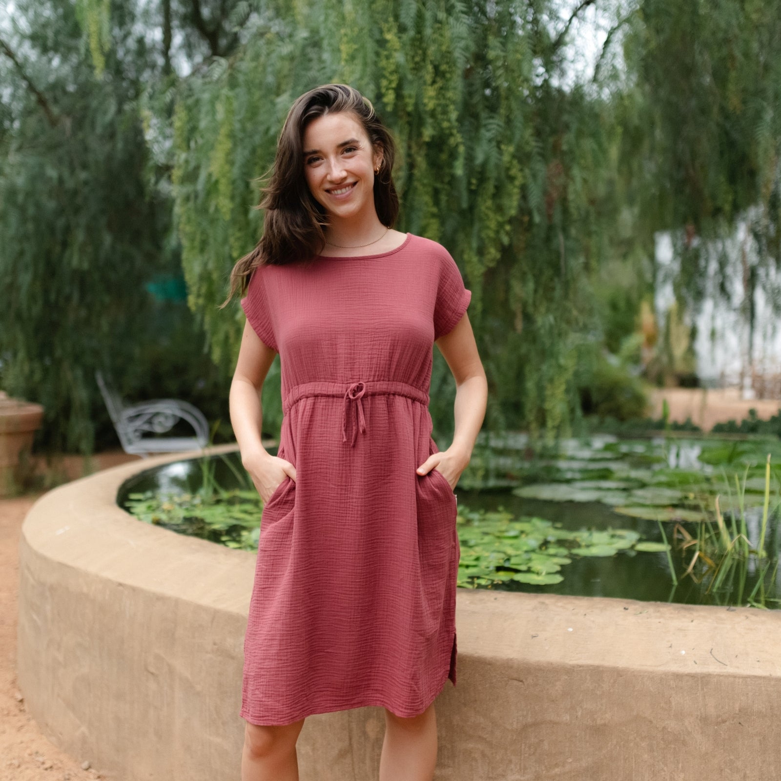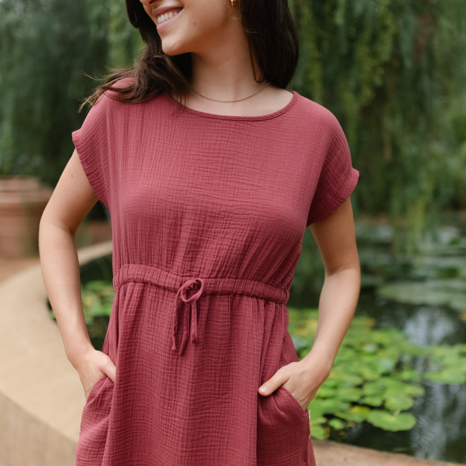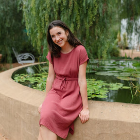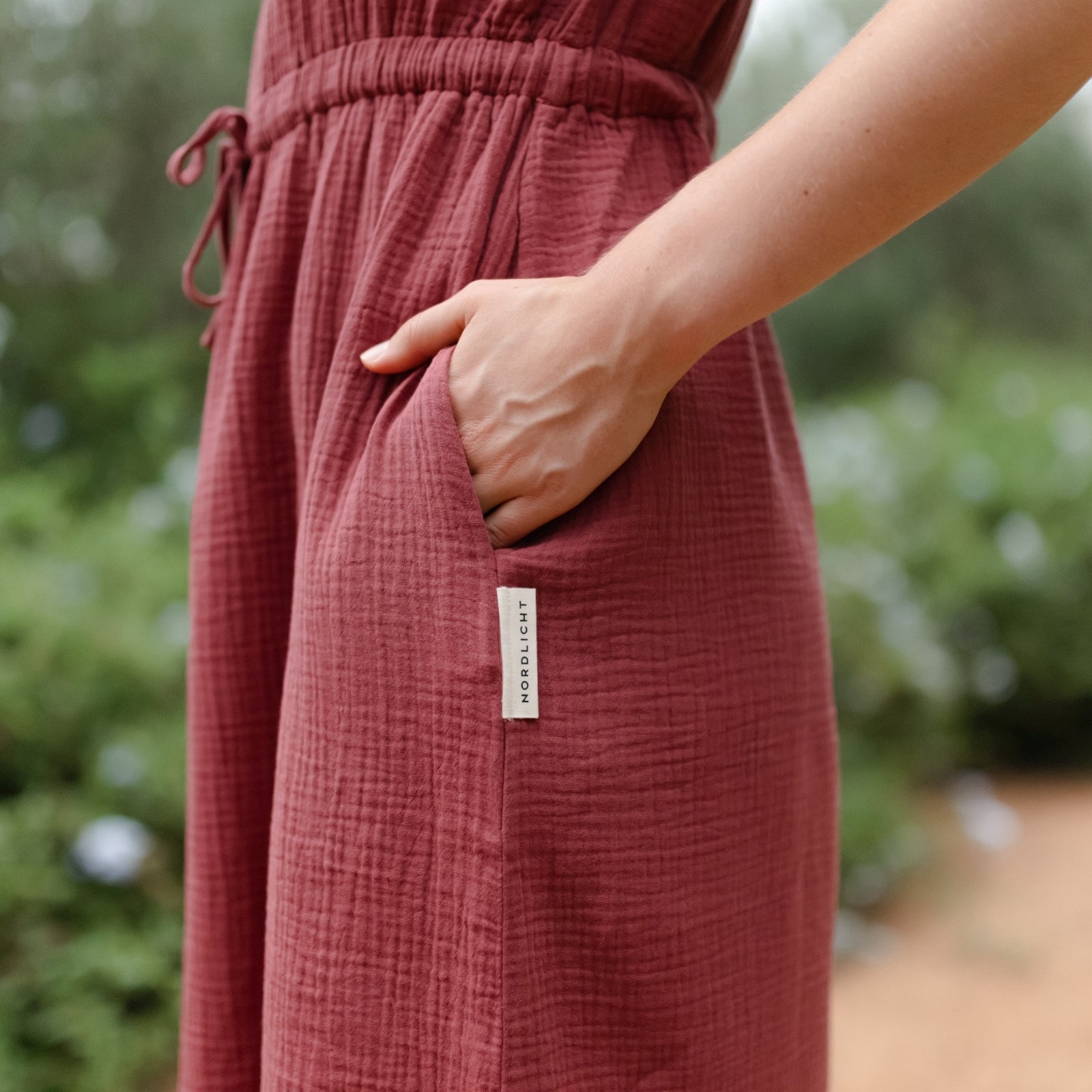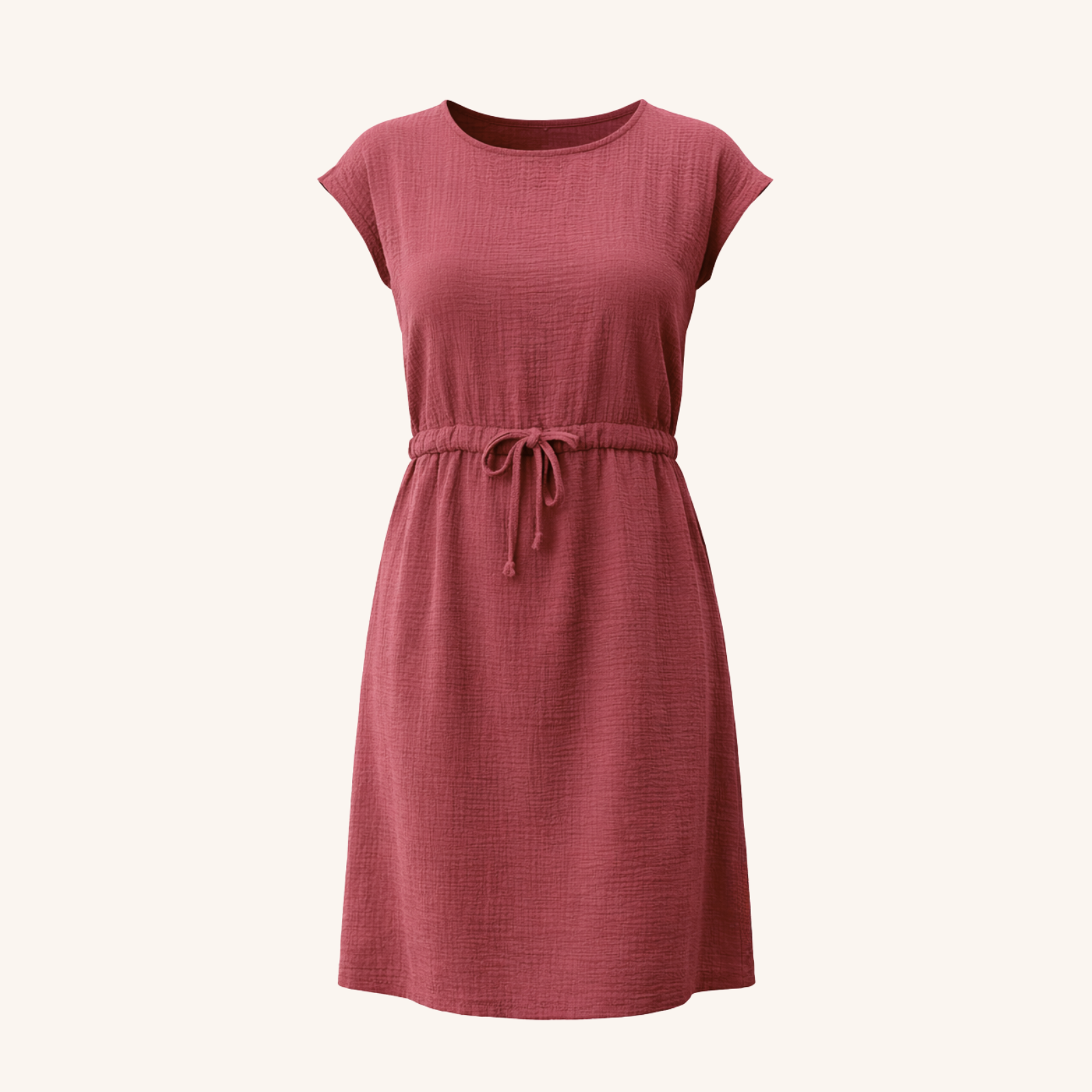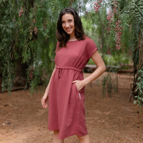Musselin aus Bio-BaumwolleDas Nordlicht Musselin Kleid Eleni ist dein unkompliziertes Lieblingsstück für warme Tage. Gefertigt aus 100% Bio-Baumwolle überzeugt der weiche Musselin mit seiner luftigen Struktur und einem angenehmen Tragegefühl auf der Haut. Kurze Ärmel und die knielange Silhouette machen das Kleid vielseitig tragbar, während der Gummizug mit Kordel in der Taille für eine individuelle Passform sorgt. Seitliche Taschen runden das Design praktisch ab und bringen entspannte Alltagstauglichkeit in deinen Look.
