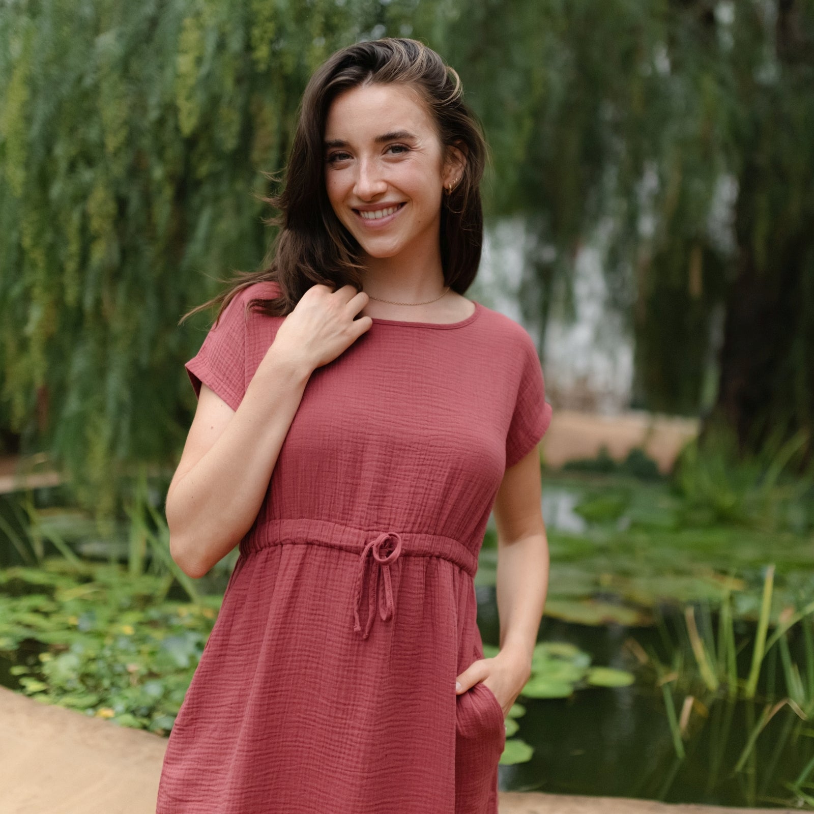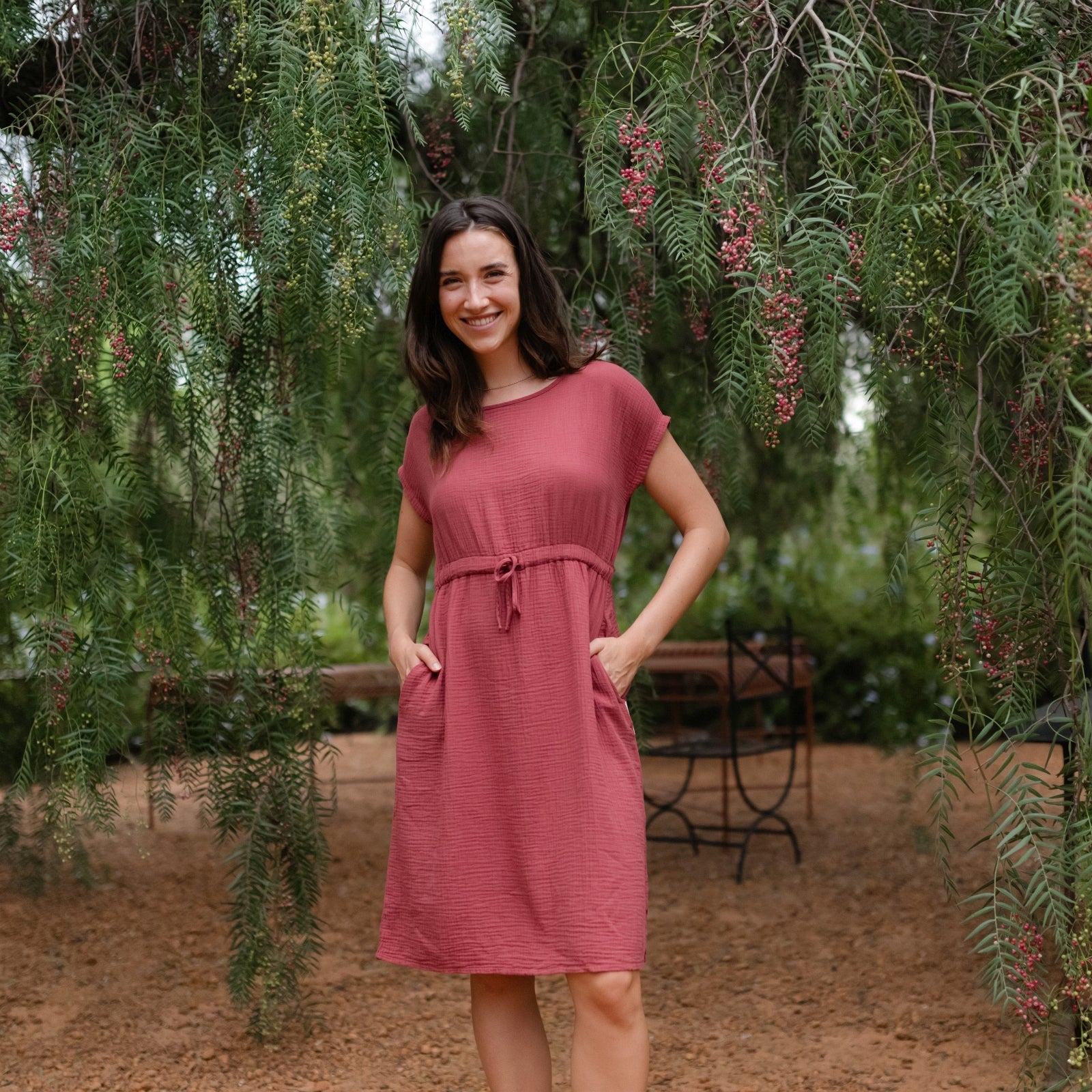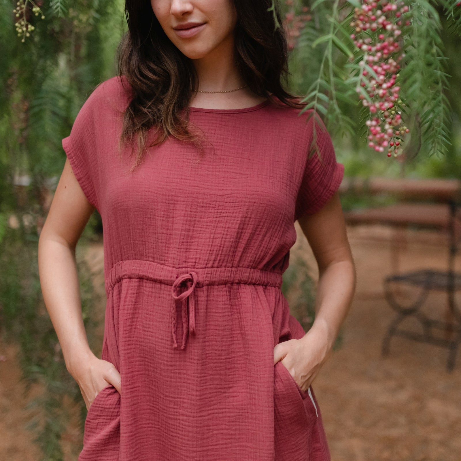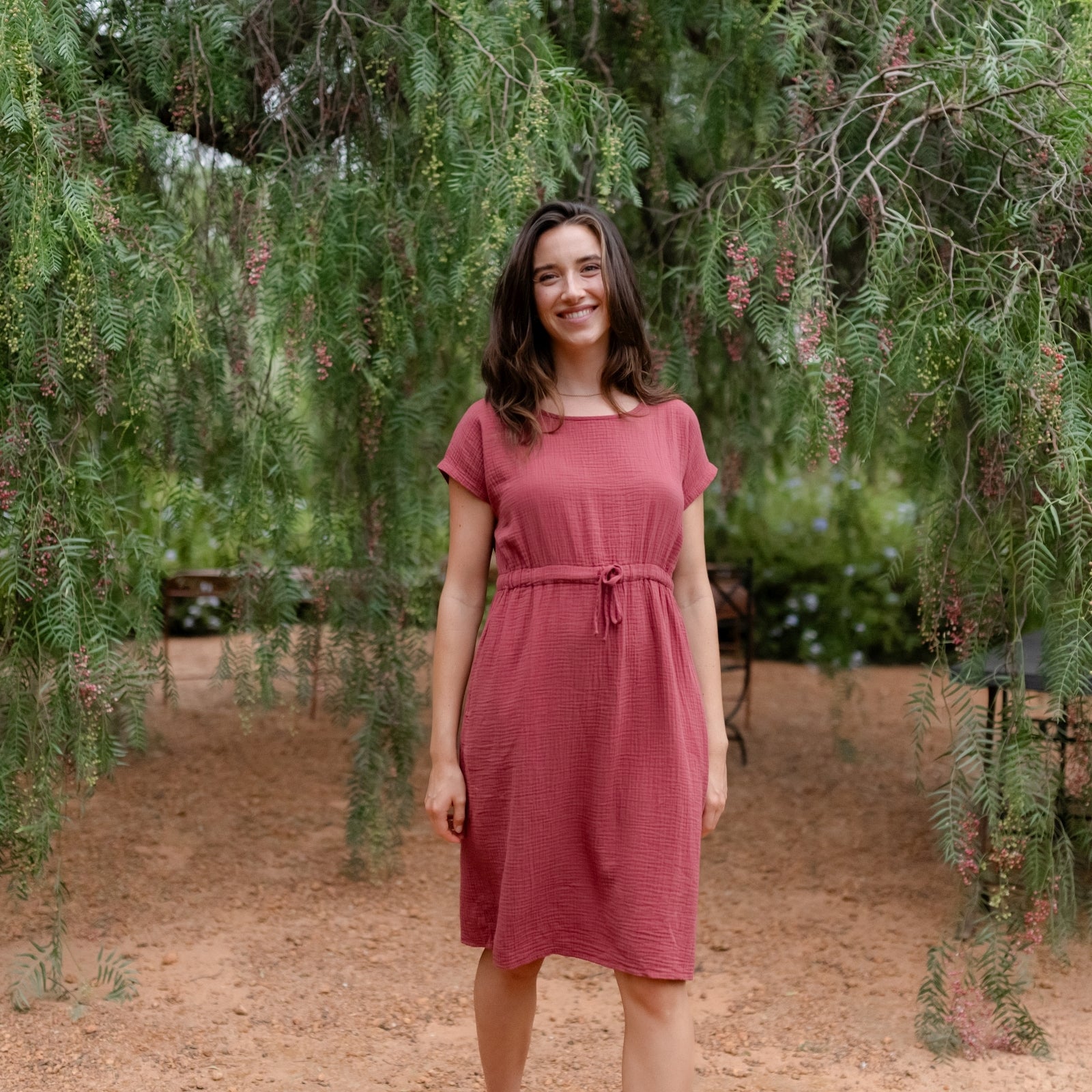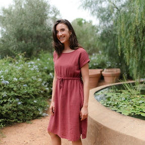 Musselin aus Bio-BaumwolleDas Nordlicht Musselin Kleid Eleni ist dein unkompliziertes Lieblingsstück für warme Tage. Gefertigt aus 100% Bio-Baumwolle überzeugt der weiche Musselin mit seiner luftigen Struktur und einem angenehmen Tragegefühl auf der Haut. Kurze Ärmel und die knielange Silhouette machen das Kleid vielseitig tragbar, während der Gummizug mit Kordel in der Taille für eine individuelle Passform sorgt. Seitliche Taschen runden das Design praktisch ab und bringen entspannte Alltagstauglichkeit in deinen Look.
