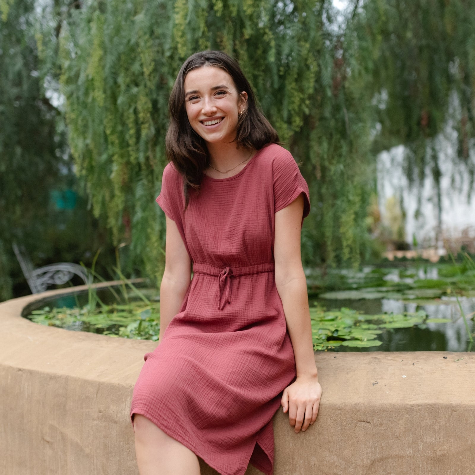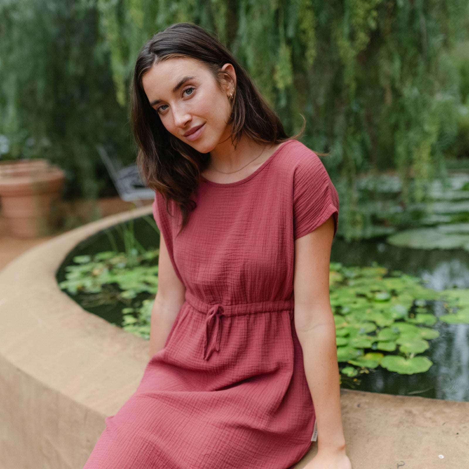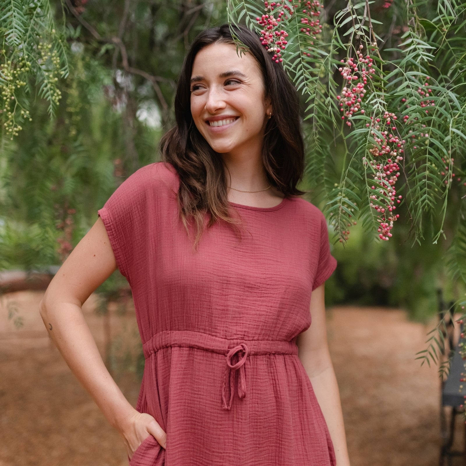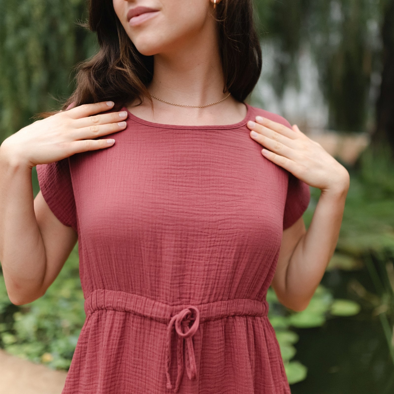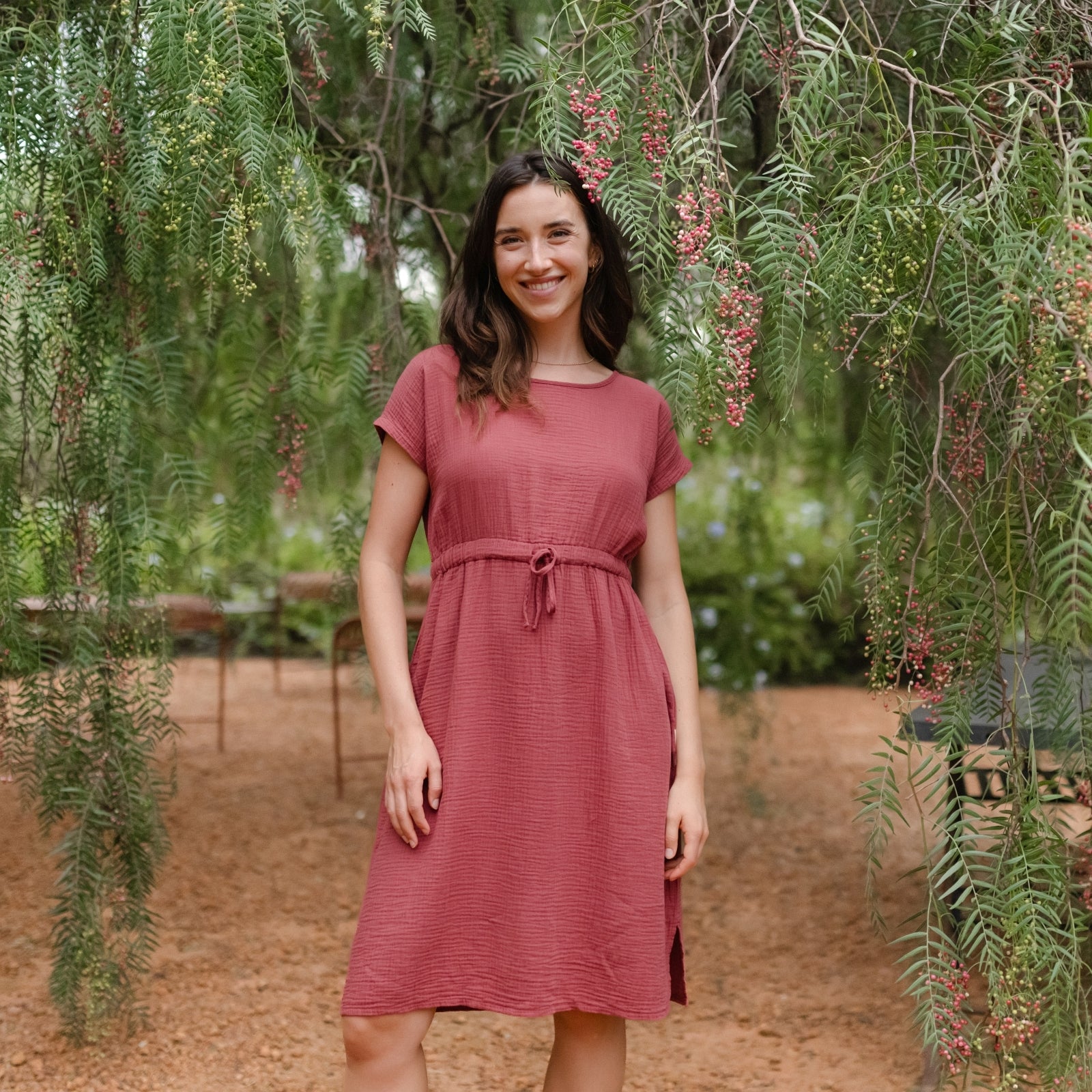 Musselin aus Bio-BaumwolleDas Nordlicht Musselin Kleid Eleni ist dein unkompliziertes Lieblingsstück für warme Tage. Gefertigt aus 100% Bio-Baumwolle überzeugt der weiche Musselin mit seiner luftigen Struktur und einem angenehmen Tragegefühl auf der Haut. Kurze Ärmel und die knielange Silhouette machen das Kleid vielseitig tragbar, während der Gummizug mit Kordel in der Taille für eine individuelle Passform sorgt. Seitliche Taschen runden das Design praktisch ab und bringen entspannte Alltagstauglichkeit in deinen Look.