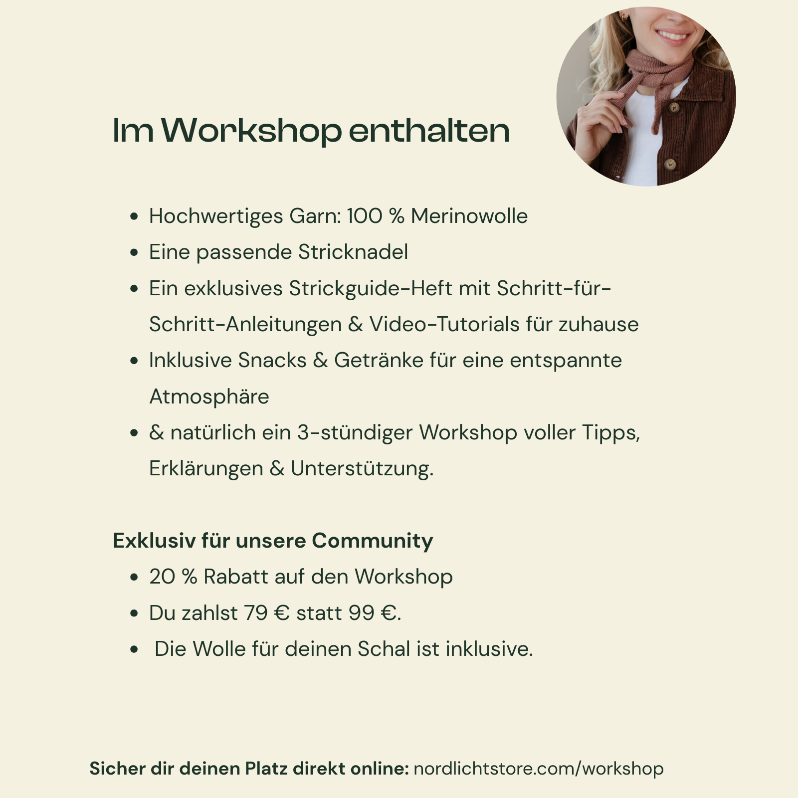 Im Workshop lernst du alle wichtigen Grundlagen, um selbstständig weiterstricken zu können. Wir starten den Schal gemeinsam, und du nimmst dein begonnenes Projekt anschließend mit nach Hause, um es dort in deinem eigenen Tempo fertigzustellen.