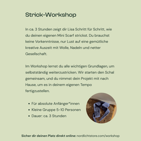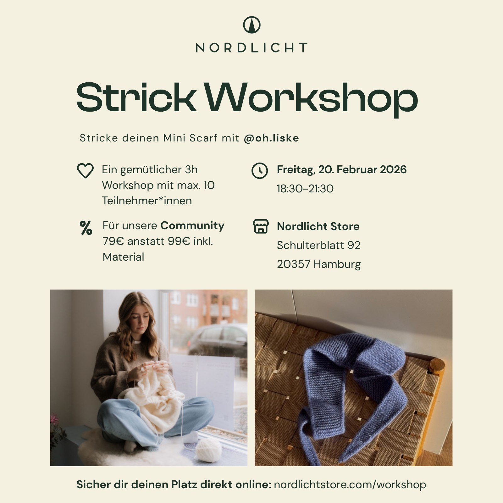Natürliche MaterialienAm 20. Februar 2026 findet im Nordlicht Store in Hamburg ein Strick-Workshop für Anfänger*innen mit Lisa von @oh.liske statt. Stricke deinen eigenen Mini Scarf und erlebe, was Slow Fashion bedeutet.
