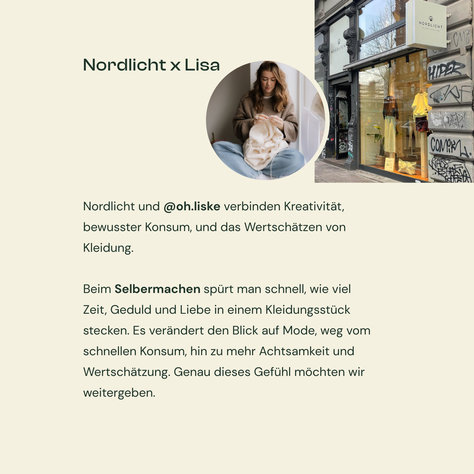 Nordlicht und @oh.liske verbinden Kreativität, bewusster Konsum, und das Wertschätzen von Kleidung. Beim Selbermachen wird schnell klar, wie viel Zeit, Geduld und Liebe in einem einzigen Kleidungsstück stecken. Wer selbst Hand anlegt, entwickelt ein neues Gefühl für Mode – weg vom schnellen Konsum, hin zu mehr Achtsamkeit und Wertschätzung. Und diese Werte wollen wir gerne weitergeben. Wolltest du immer schonmal stricken lernen? Dann ist jetzt der richtige Zeitpunkt. Lisa zeigt dir, wie du dir dein eigenes Lieblingsteil strickt: